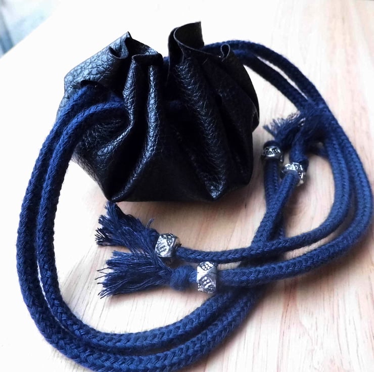 Made from black soft faux leather, with blue cord ties and silver plastic beads,