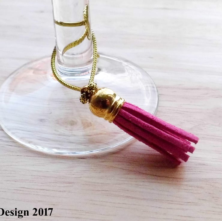 Well with these lovely brightly coloured tassled wine glass markers you will know which glass belongs to you. Made from real leather, with a gold plastic top and threaded on gold coloured cord.