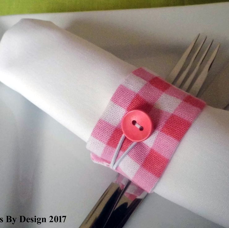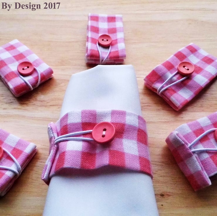 They are made from pink, red & white gingham cotton, with a white elastic loop, which fastens over a pink plastic button.