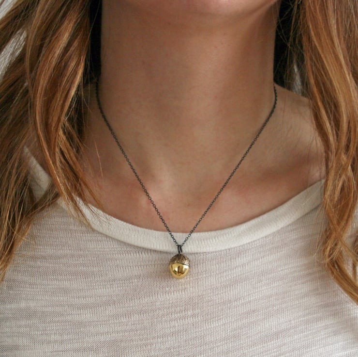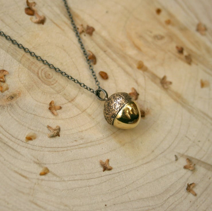 Crafted in brass and hung on an oxidised (blackened) sterling silver chain this woodland inspired pendant is created from a casting of an actual acorn cap set with a hand formed brass acorn charm.