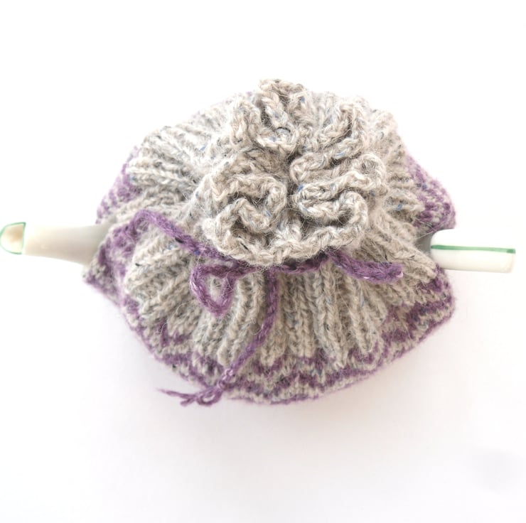 This is a pretty cute tea cosy for your 2 cup pot. An easy fair isle knit, comprising of a 6 stitch, 4 row pattern repeat fair isle pattern. A great one to start your fair isle experience with.