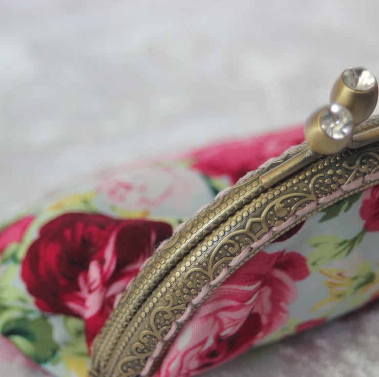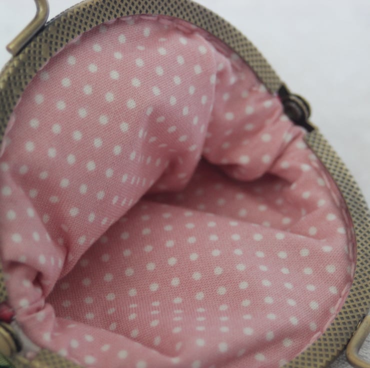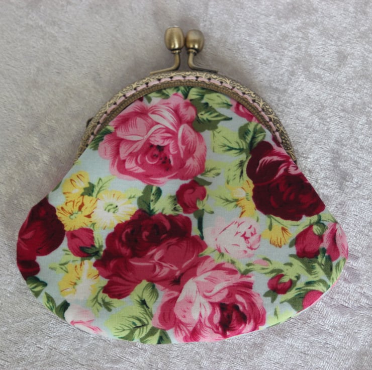 This cute little coin purse is made in a cotton fabric with a busy rose design and is large enough to hold a plastic card and your small change. It is lined with a pale pink cotton with a tiny white dot design and the metal clasp is sewn with pale pink embroidery silk. Suitable for all ages this would make a wonderful gift or a treat for yourself.