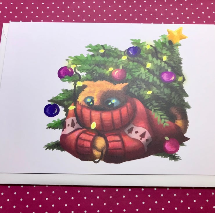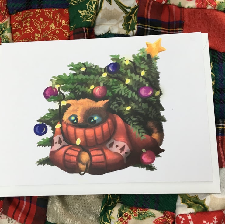 From the Seasonal Cats series - 'Winter' Christmas Tree Cat blank greeting card with white envelope by DuffleCat Prints (Damian Case)