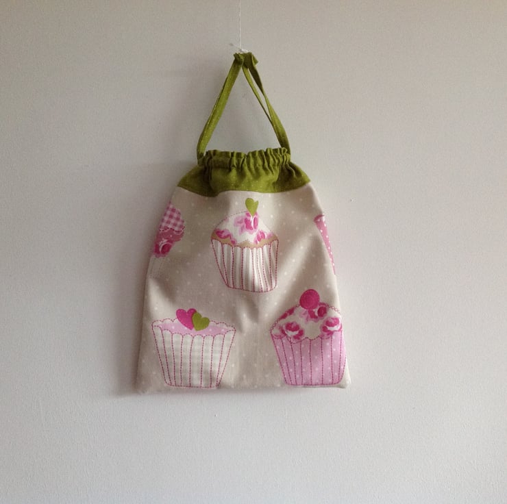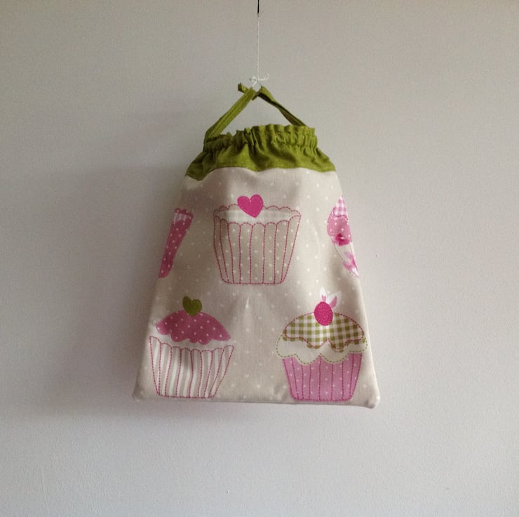 This washbag is made from cupcake cotton with a contrasting top in green polka dot fabric. It is lined with waterproof fabric making it suitable as a washbag or for toiletries.