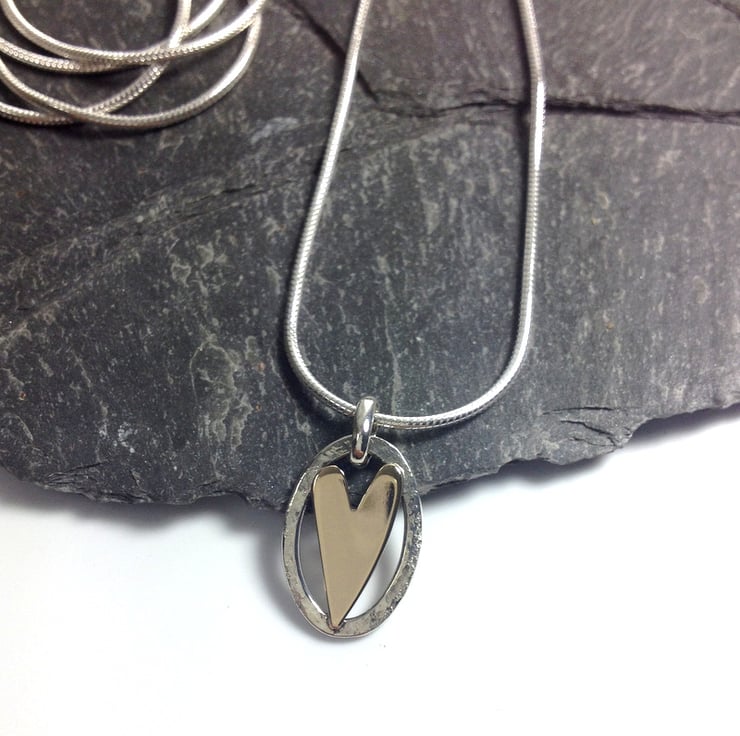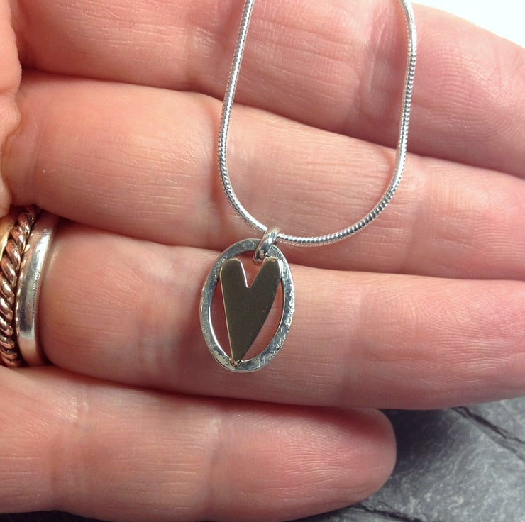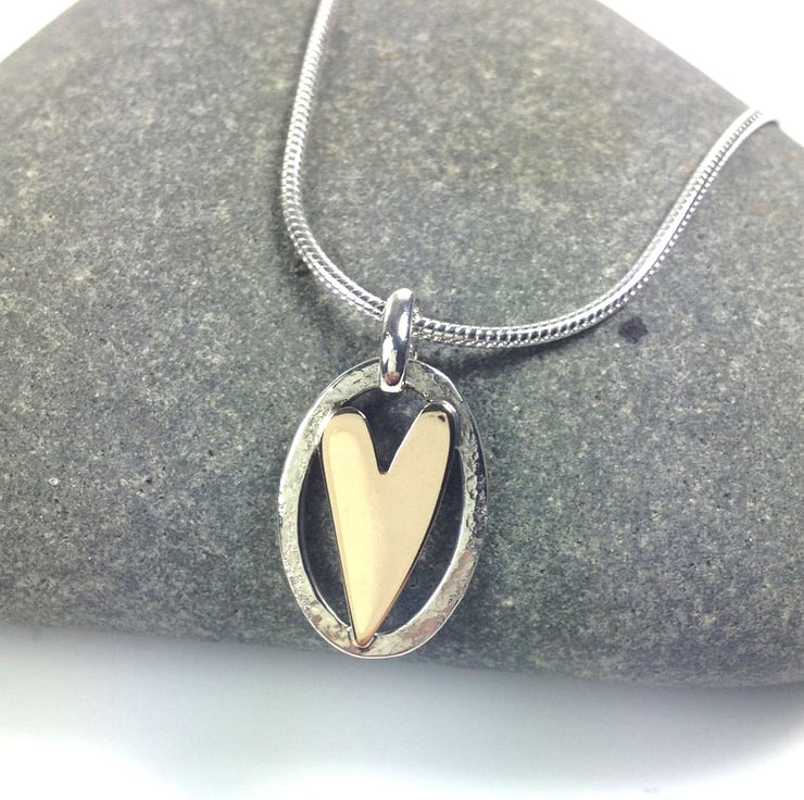 A brightly polished heart, cut from 9ct yellow gold, has been soldered to a oval frame of textured silver.