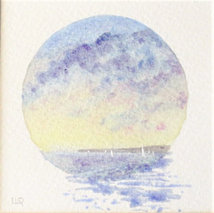 An original painting of a sunset across the bay with yachts sailing. This small watercolour vignette measures 9x9cm (approx 3.5x3.5inch) mount aperture. The exterior of the mount measures 15.5x15.5cm (6x6inch).