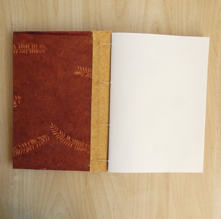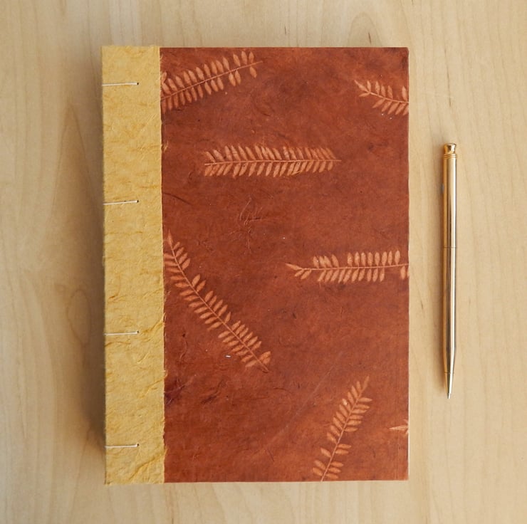 The outside and inside of the covers are in a chestnut coloured Nepalese Lokta paper, imprinted with delicate fern leaves.