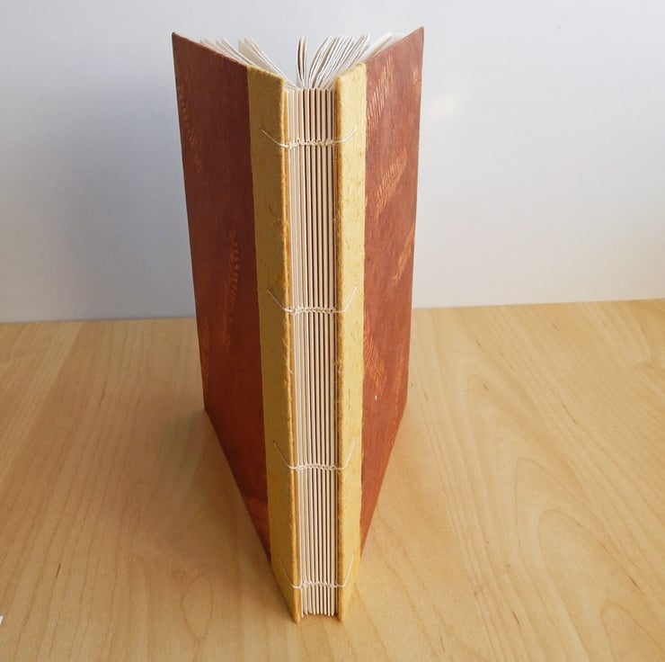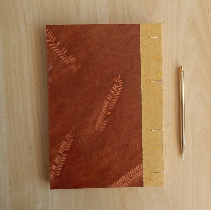 A hand bound journal in warm brown with a fern leaf design and edging of golden silk paper.