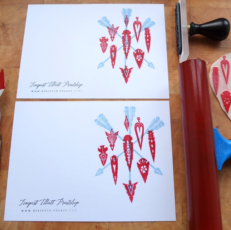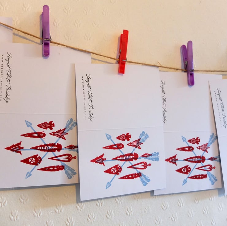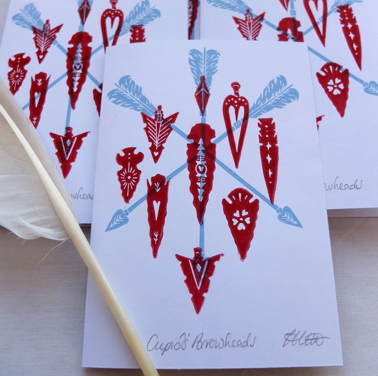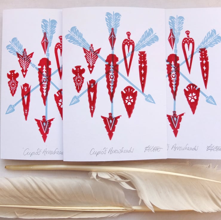 This listing is for a original lino print card, sold singly. This unisex design is suitable for Valentine's, anniversary or wedding for example. Made up of 2 layers, a pale blue for the feather arrows and a deep red for the arrow heads.