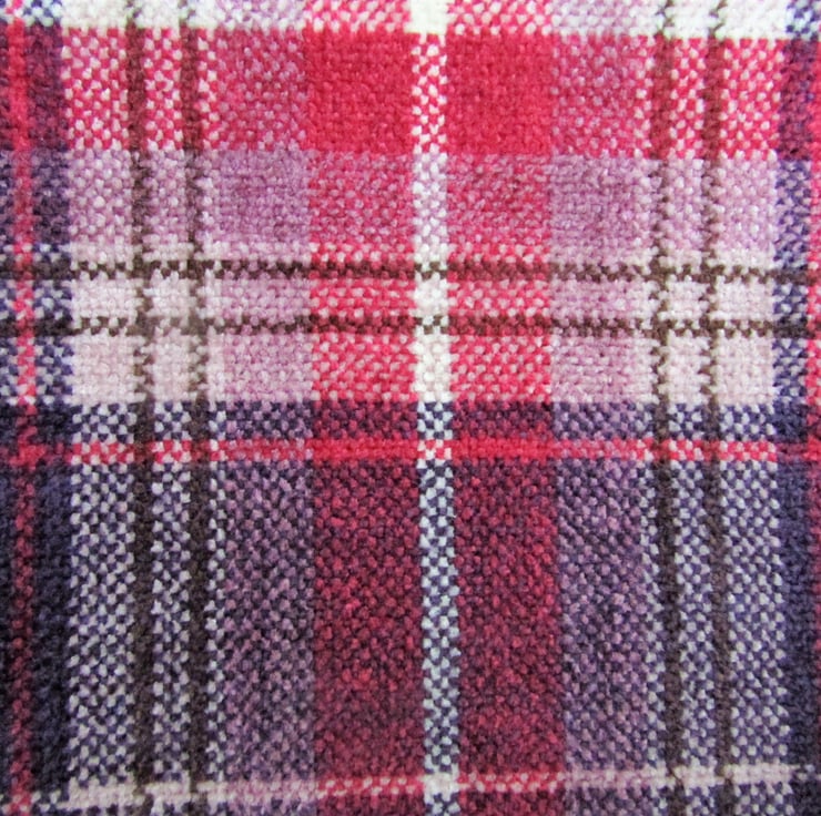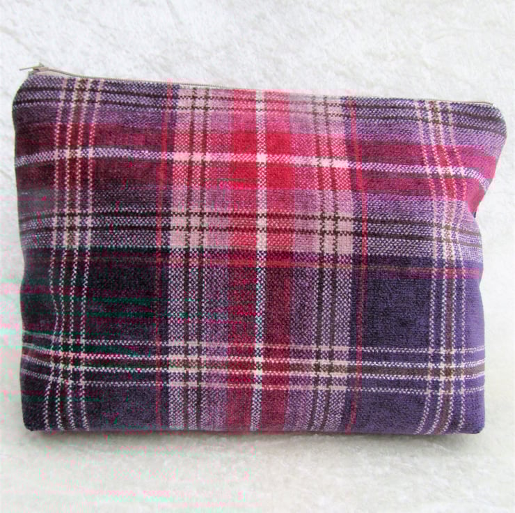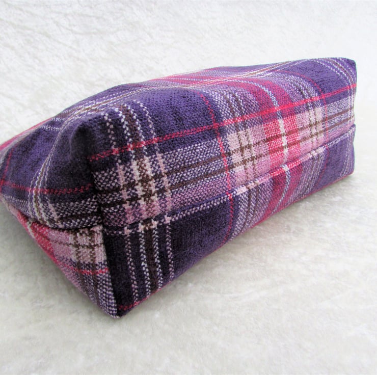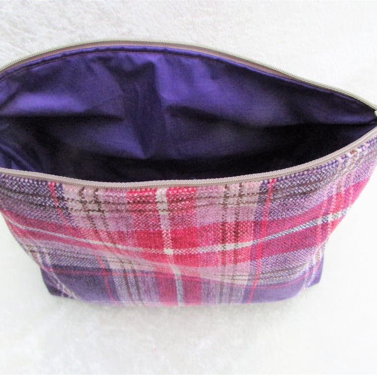 A delightful toiletry bag in tartan tweed fabric in cheerful shades of pink, purple and white. The bag has a zip fastening and the inside is fully lined with a purple waterproof lining. The base of the bag is boxed giving a spacious interior.