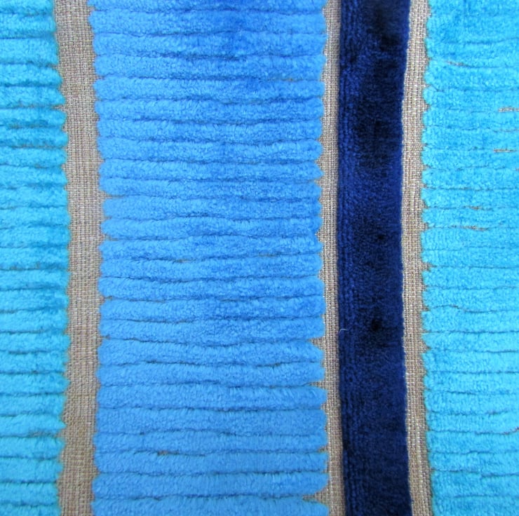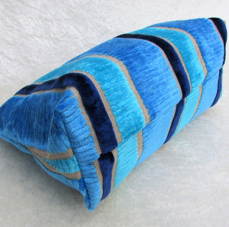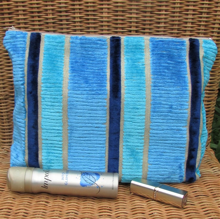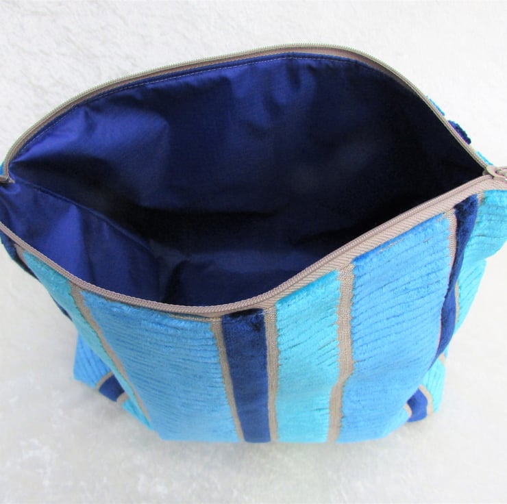 A luxurious striped toiletry bag in velvet-finish textured fabric in lovely shades of turquoise, blue and beige. The bag has a beige zip and the inside is fully lined with a blue water-resistant lining. The base of the bag is boxed giving a spacious interior.