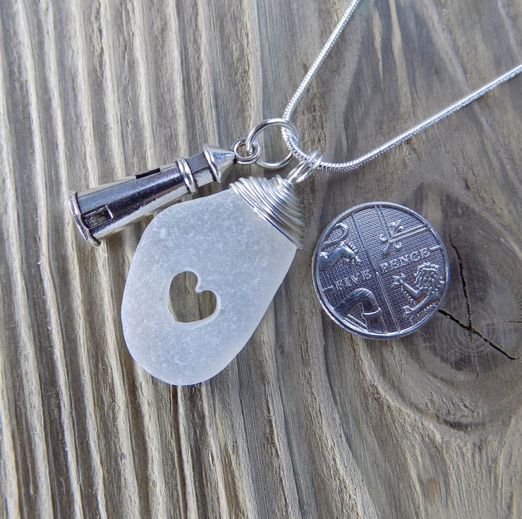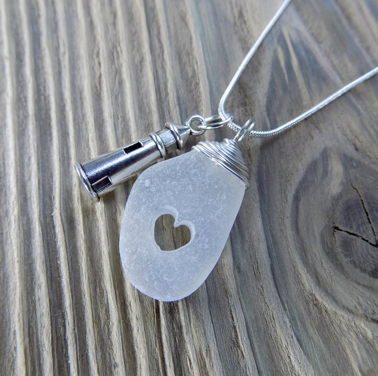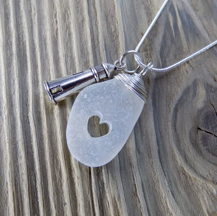 Made from natural white sea glass and non tarnish silver plated wire. I have carefully drilled a heart within the glass, then wire wrapped the top to make a pretty bail. I've added on a gorgeous lighthouse charm. Suspended on an 18" silver tone snake chain.