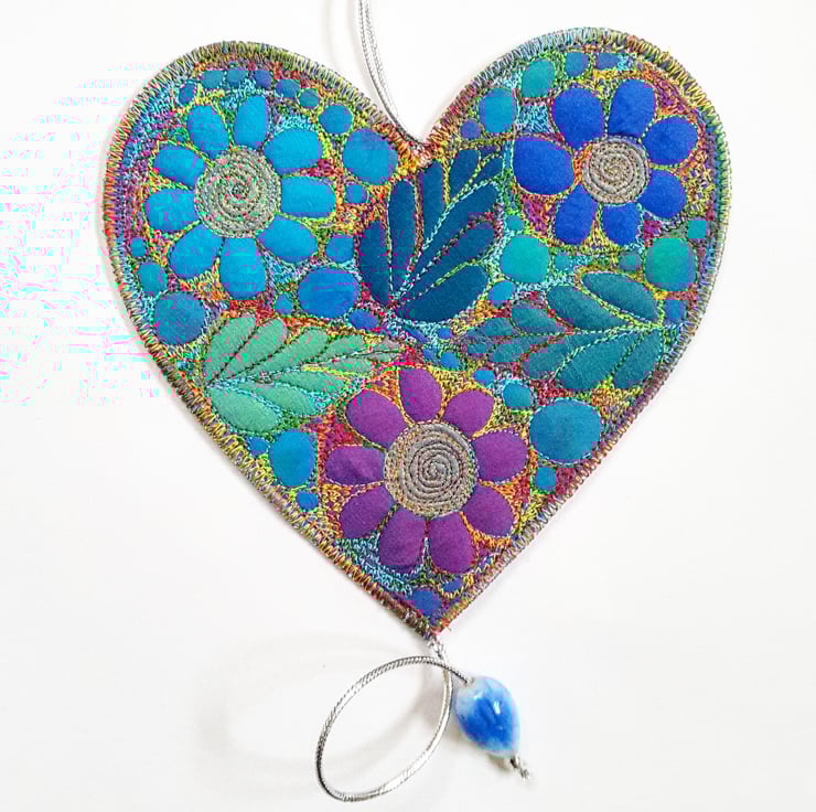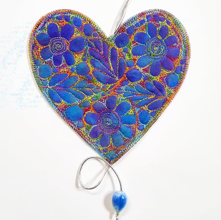 This is a handmade machine stitched textile hanging heart decoration,