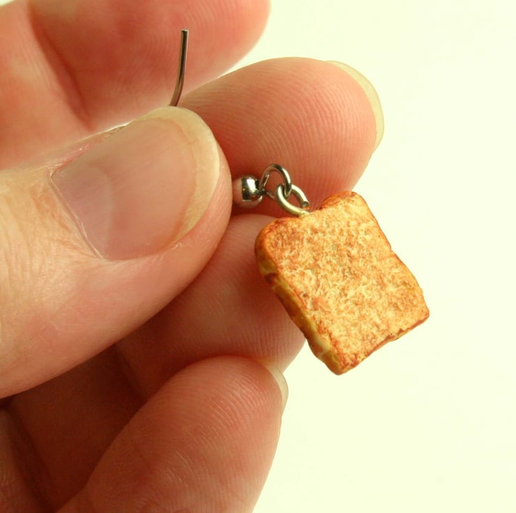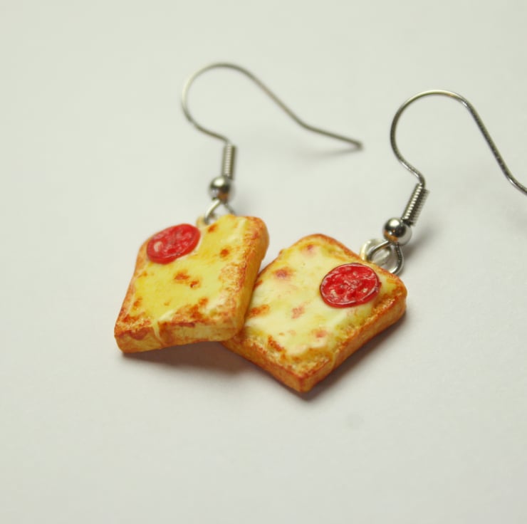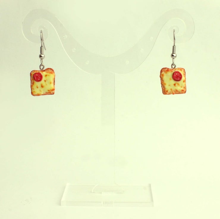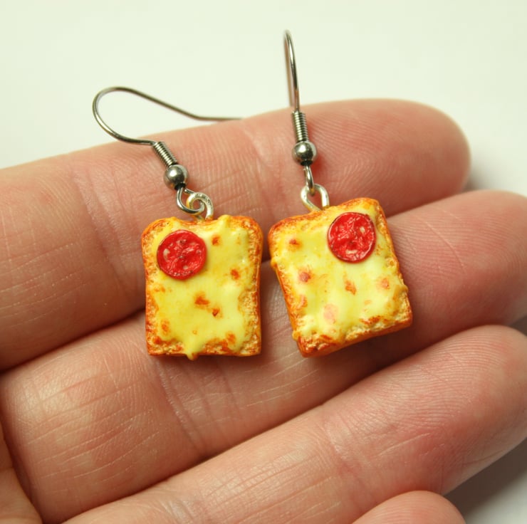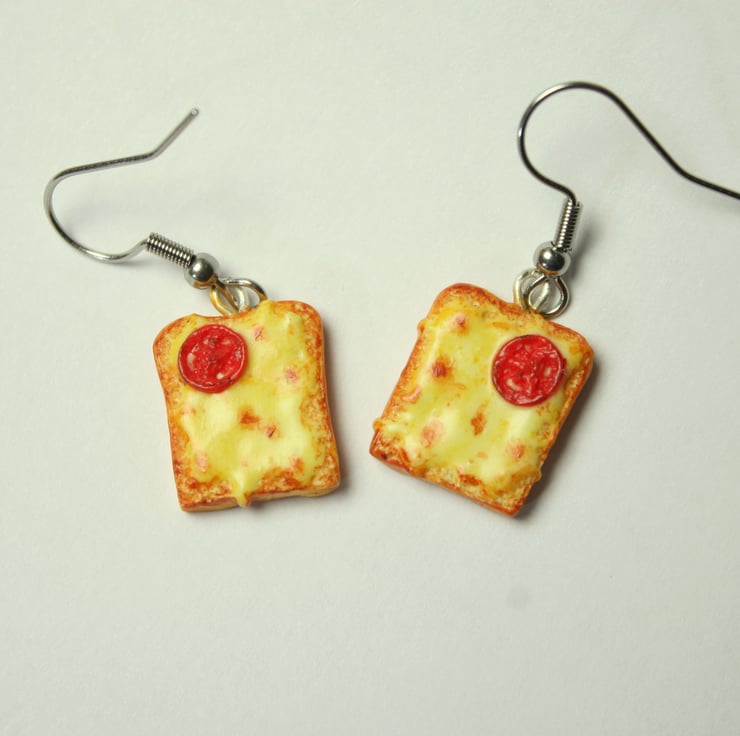 These tasty little morsels are individually crafted from polymer clay and carefully hand painted and varnished, with a slice of clay tomato on each to add a dash of colour. The ear wires they hang on are hypo allergenic surgical steel and they come ready to gift in a smart black box.