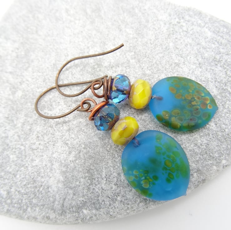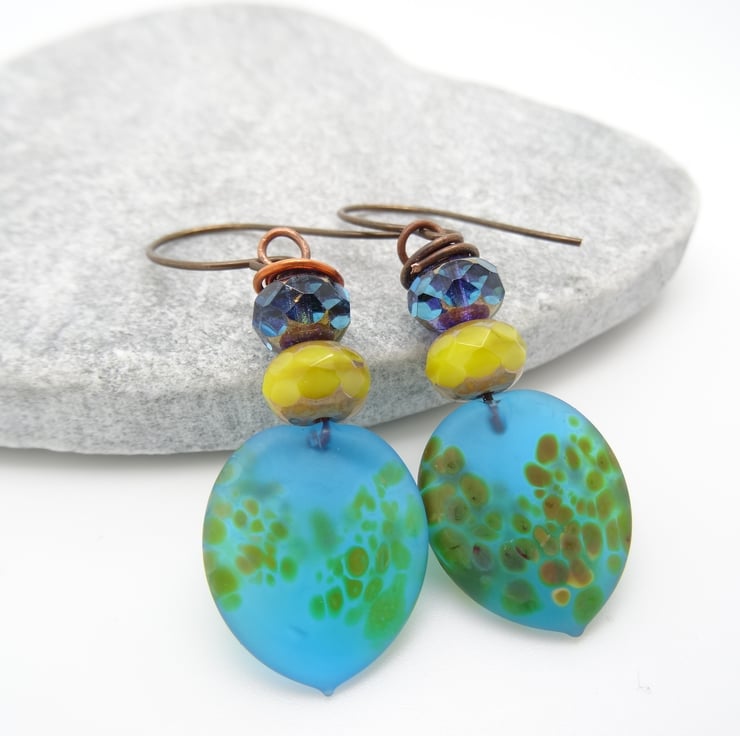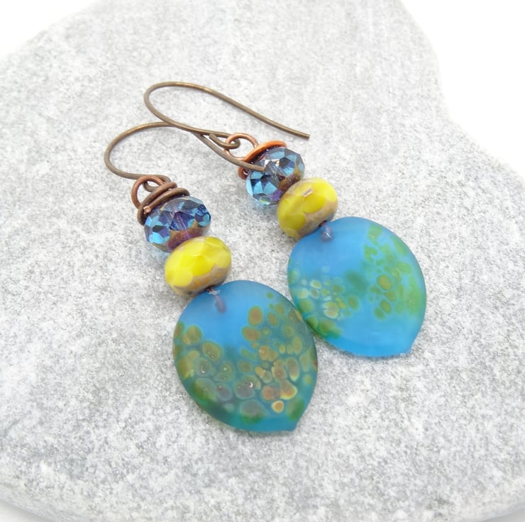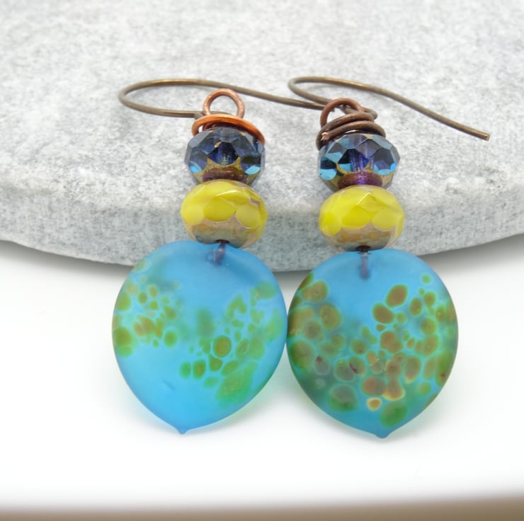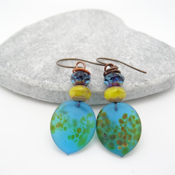 These are beautiful earrings made with handmade lampwork beads by artisan Elasia in the US. The lampwork beads are a paddle shape in a vivid aqua blue with a lemon bubble type pattern, they measure 20 x 18mm and are etched (frosted). To these I have added 9 x 6mm czech glass faceted rondelle beads in aqua and lemon. The earrings measure 2 inches (5cm) from top of vintaj brass, round loop, nickel free earwires. As all of the items in my shop are unique, individual pieces made by myself, these are the earrings you will receive. They will arrive gift wrapped in tissue paper and a organza bag.