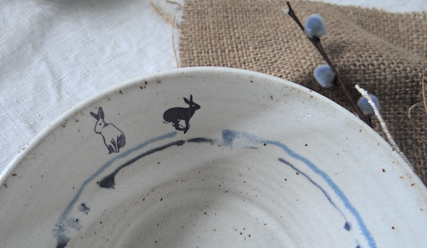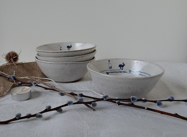 A generously sized handmade bowl ideal for cereal, soup, pasta, rice and desserts. I made it from strong flecked stoneware clay and finished it off with two cute hare rabbit images drawn by Zanna - zannaallenillustration.co.uk. Fired into the glaze at over 800 degrees C, these images will not fade over time.