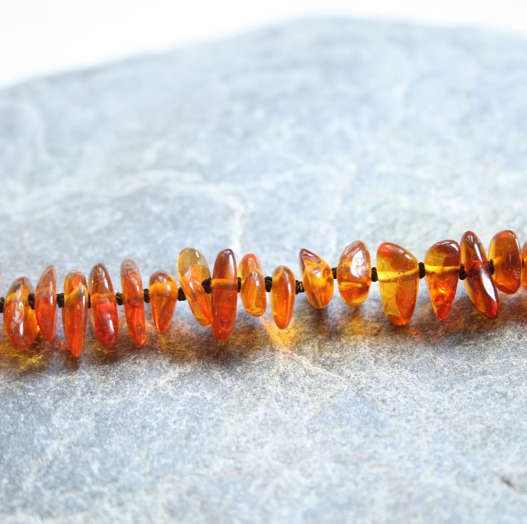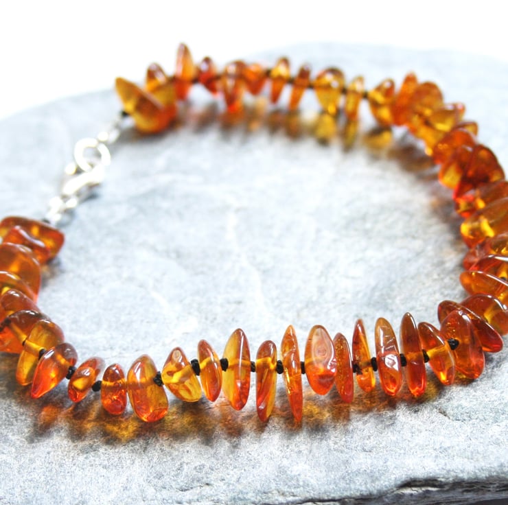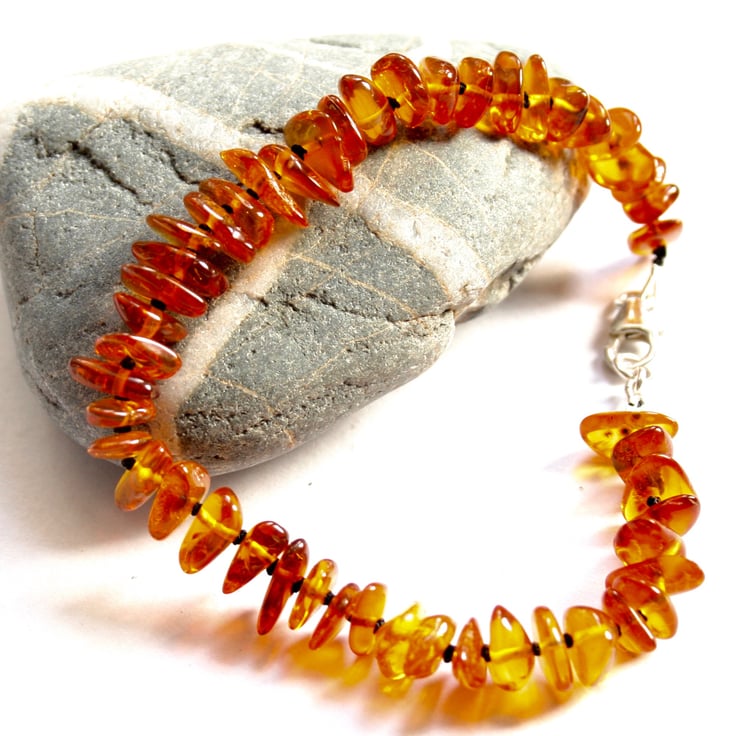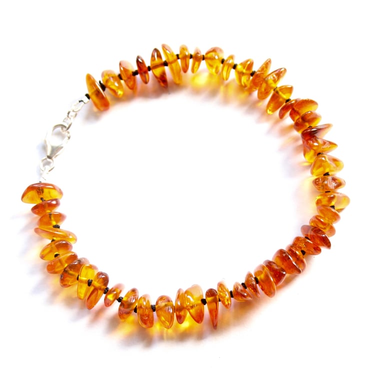 I have created this Baltic amber chip bracelet by knotting black thread between each chip and finishing it off with a sterling silver clasp. The bracelet measures 20.5cm (8 inches) although if you contact me I can make one to your measurements.