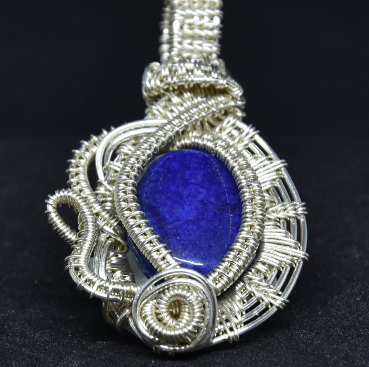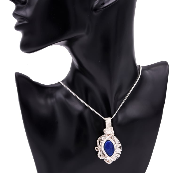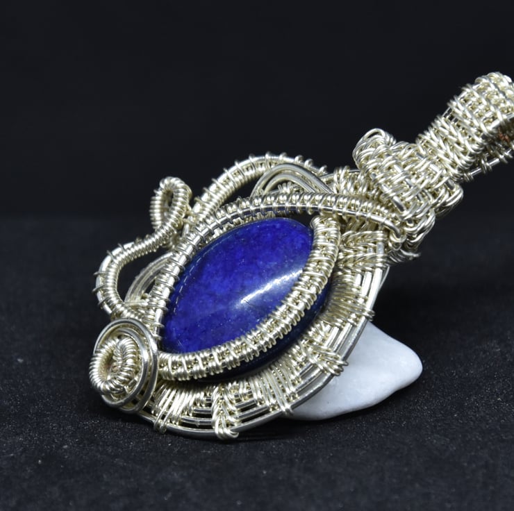 This pendant is made using silver plated copper wire; in the middle of it is a 2 cm long Laspis Lazuli stone.