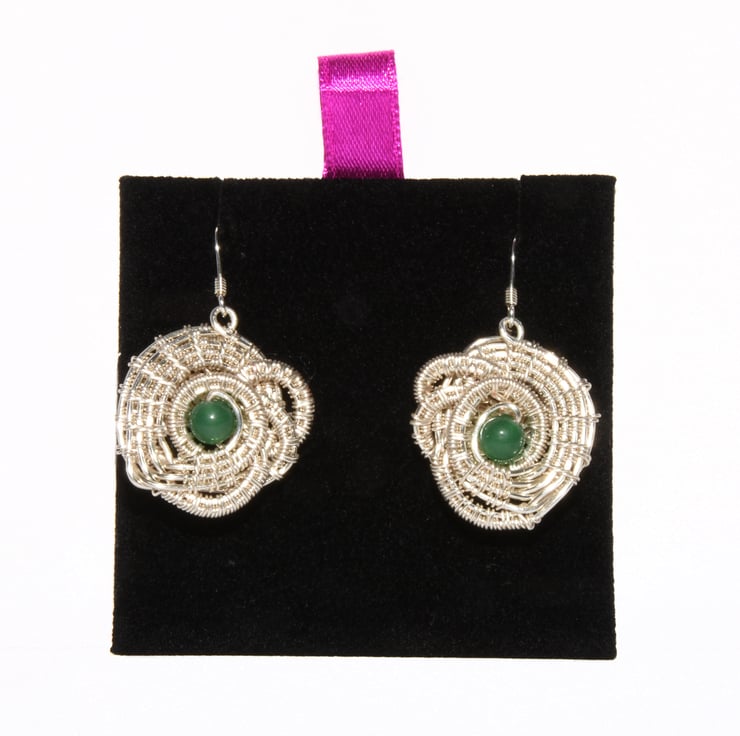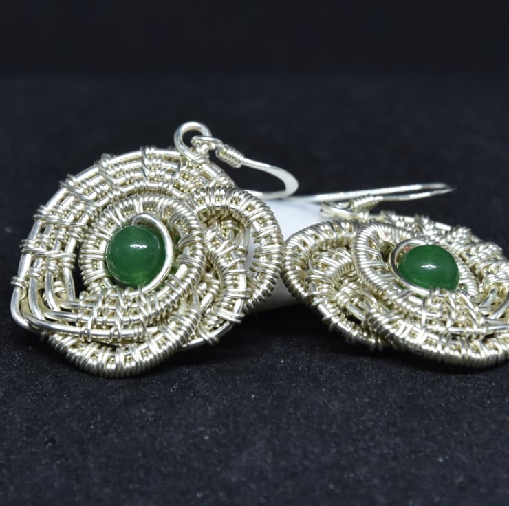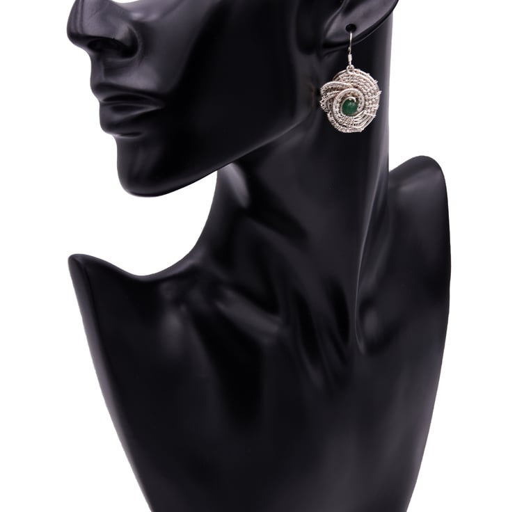 Each earring has a Green semi precious Jade stone bead at the center. Each Jade bead is 0.5 cm in diameter.