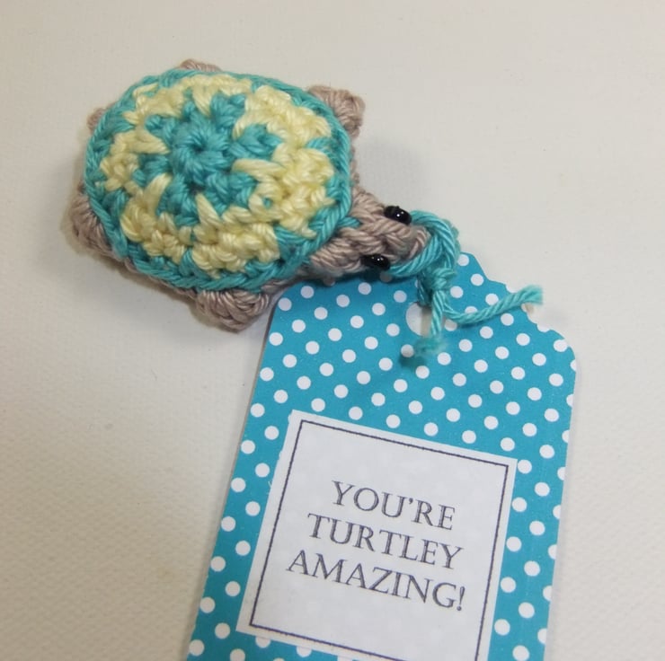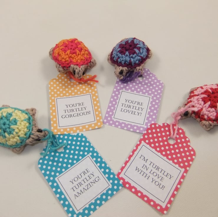 These colourful little turtles are crocheted from a lovely pattern by Lucy Ravenscar. They are filled with polyester stuffing and have black beady eyes. Each carries a tag in its mouth with words of appreciation on one side and space on the back for a personal greeting; perfect for leaving about the home to tell a special person how great you wonderful they are! (They could even be made into a treasure with a clue on the back of each!!)