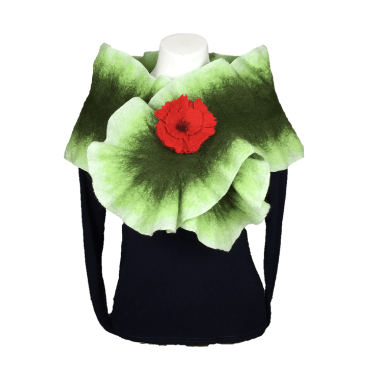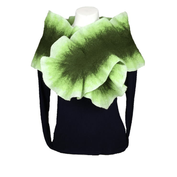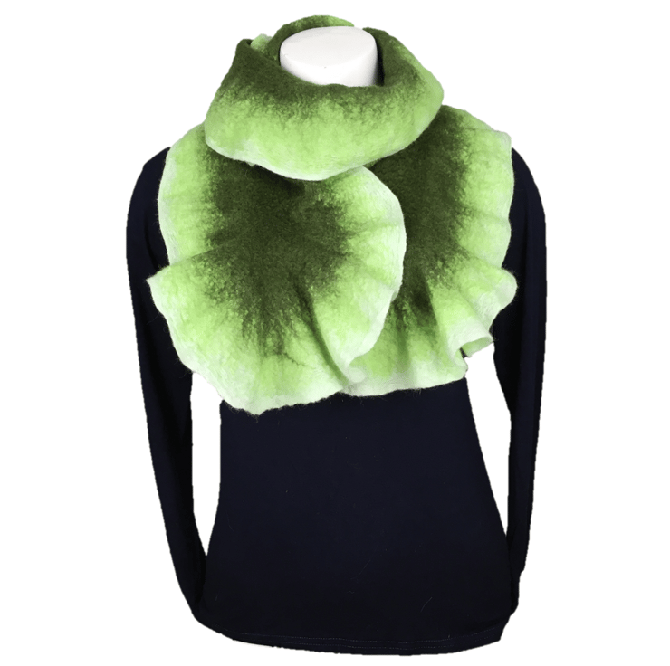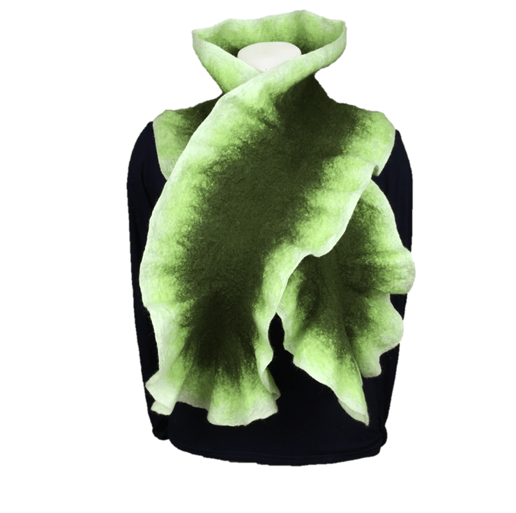 This very striking scarf has been hand felted in various shades of soft green merino wool. The woollen fibres have been felted in such a way as to create a gorgeous structural ruffle around the border.