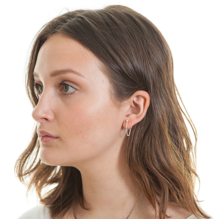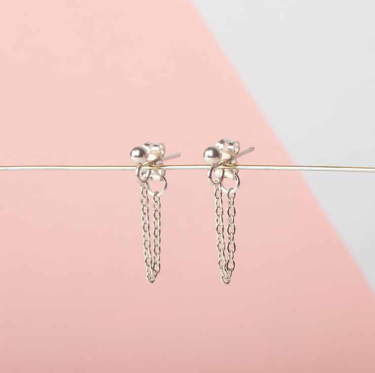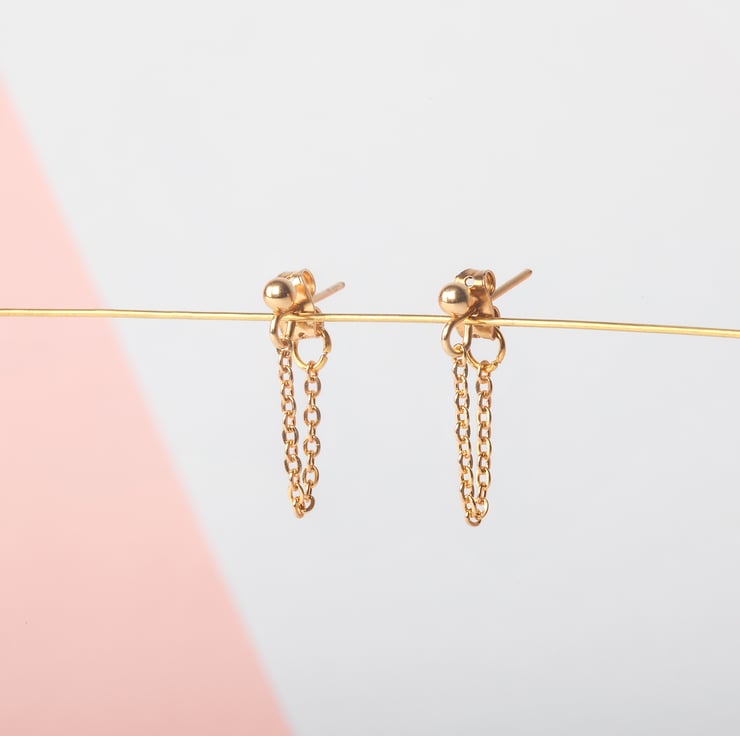 Simple and minimalist chain earrings with plain studs and a short chain drop connected from front to back.