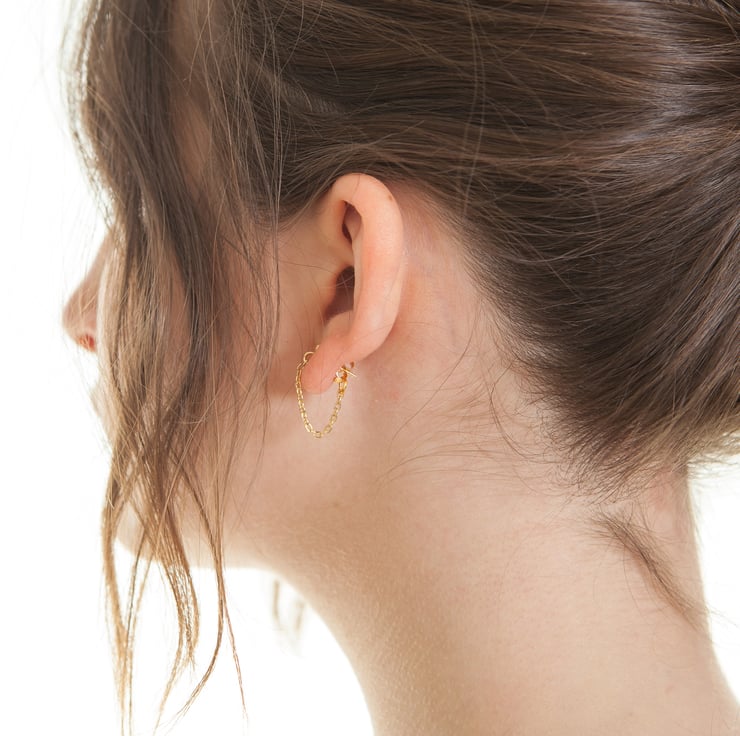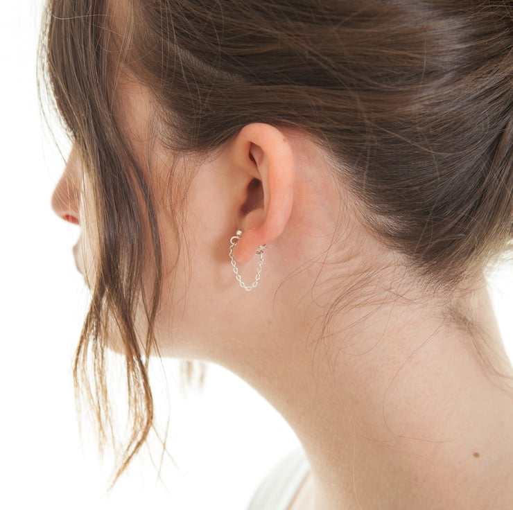 The delicate chain is fixed to the stud at the front and drapes just beneath the ear lobe, connected to the butterfly at the back.