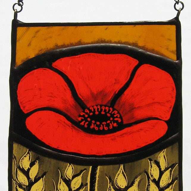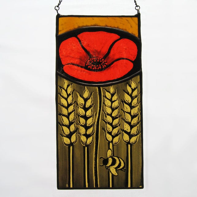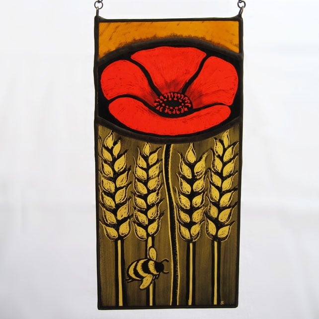 Created using traditional stained glass techniques and materials this panel has been hand painted onto antique style, red and amber glass and fired in a kiln. The tracing paint fuses together with the glass making the image permanent and enduring.
