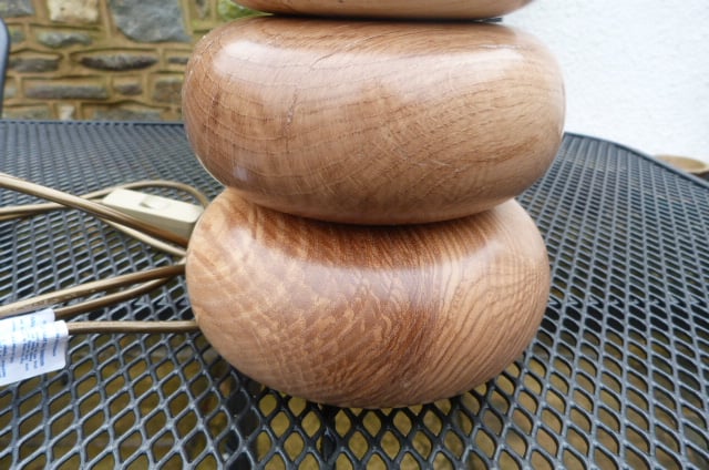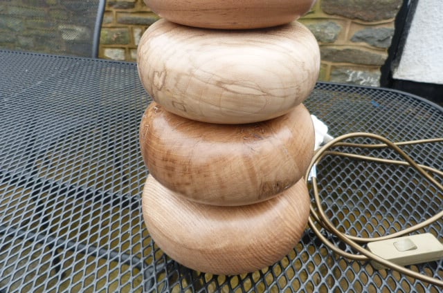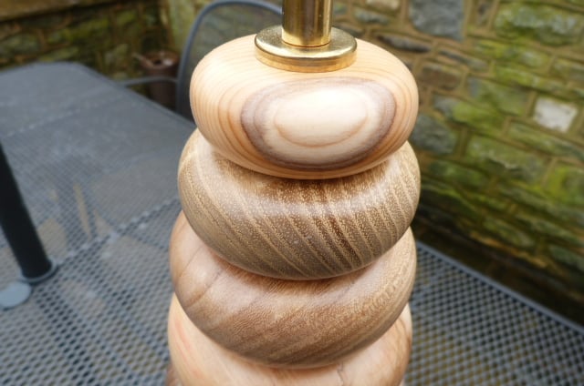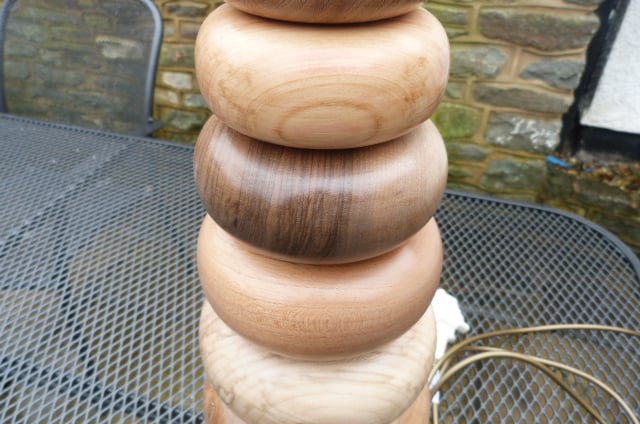 A LAMP FROM NINE DIFFERENT WOODS, FROM THE BASE, ASH ,OAK,SPALTED BIRCH,AMERICAN CHERRY,ENGLISH WALNUT,BOX ELDER,ENGLISH ELM,ACACIA AND YEW AT THE TOP, WITH THE BRASSWORK THIS MAKES A FINISHED HEIGHT OF 19-1/2'', THE ASH TO THE BASE HAS A DIAMETER OF 6-1/2''. A HEAVY SOLID PIECE FINISHED WITH WOODWAX. WIRED WITH THREE PIN PLUG AND INLINE SWITCH AS STANDARD.