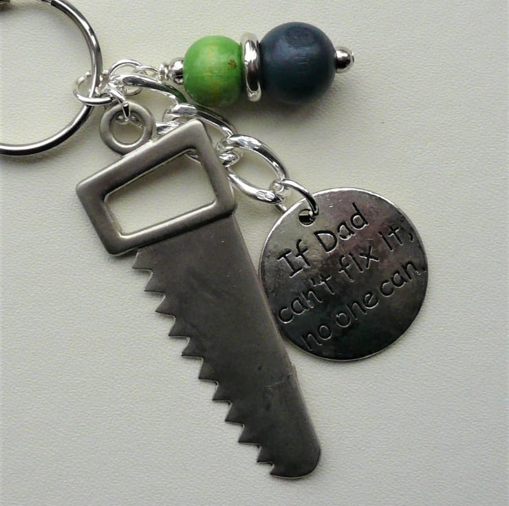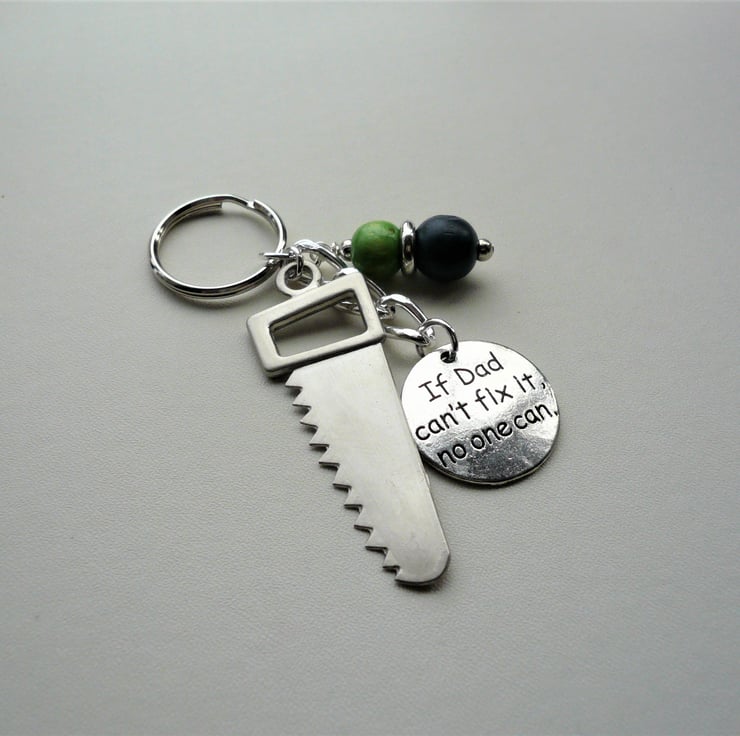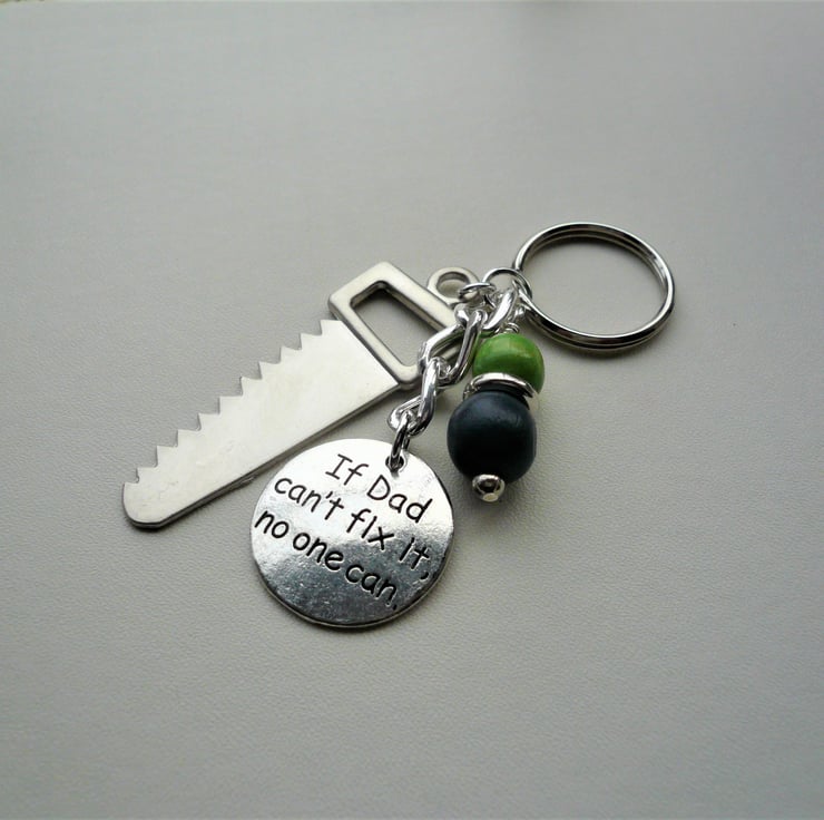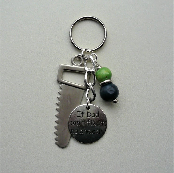 Keyring for Dad! - 10mm round navy blue and green wooden beads and silver metalised acrylic spacer bead teamed with 45mm long silver coloured tool saw charm and 25mm "If Dad can't fix it no one can" disc charm. All attached to 25mm keyring and measuring approx 8.5cm long.