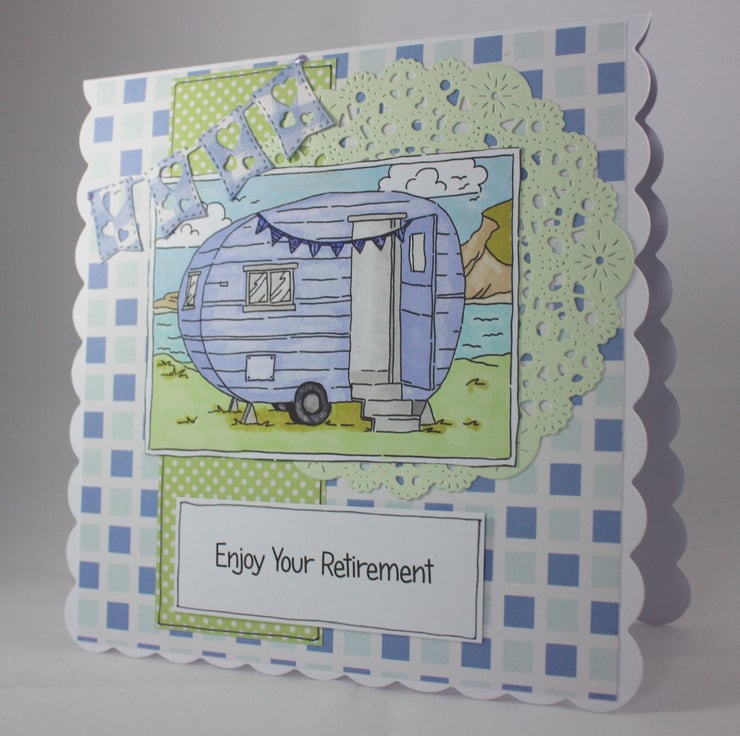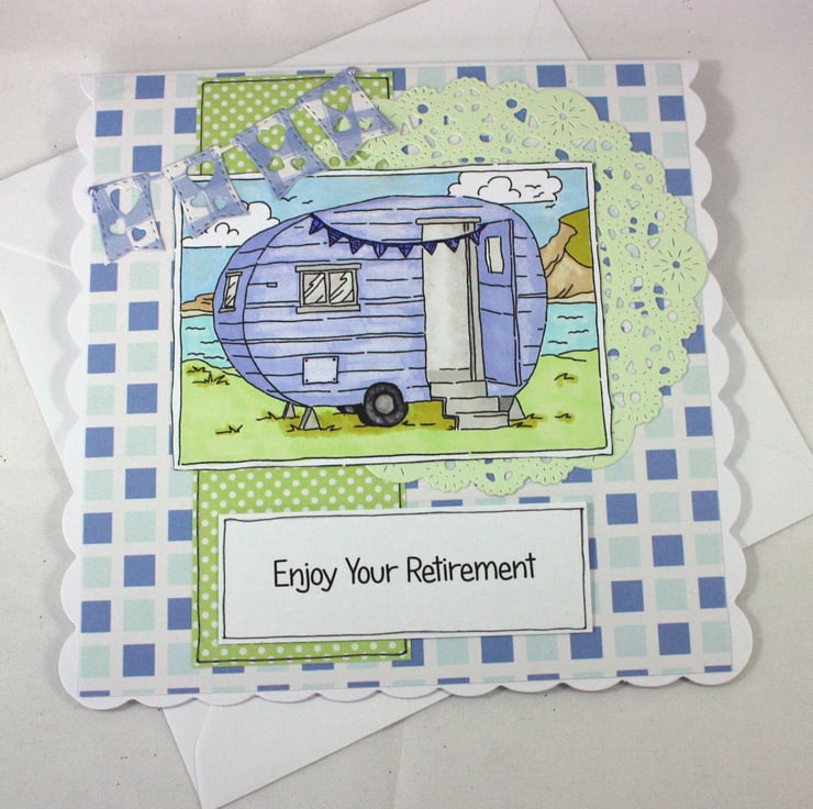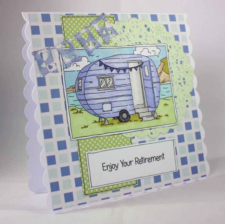 Square, scalloped, retirement card on a caravanning theme. The main caravan image has been coloured and layered over a pale green, die cut doily, green spotty paper and two tone blue patterned paper. The card is finished with die cut bunting and the message 'Enjoy Your Retirement'.