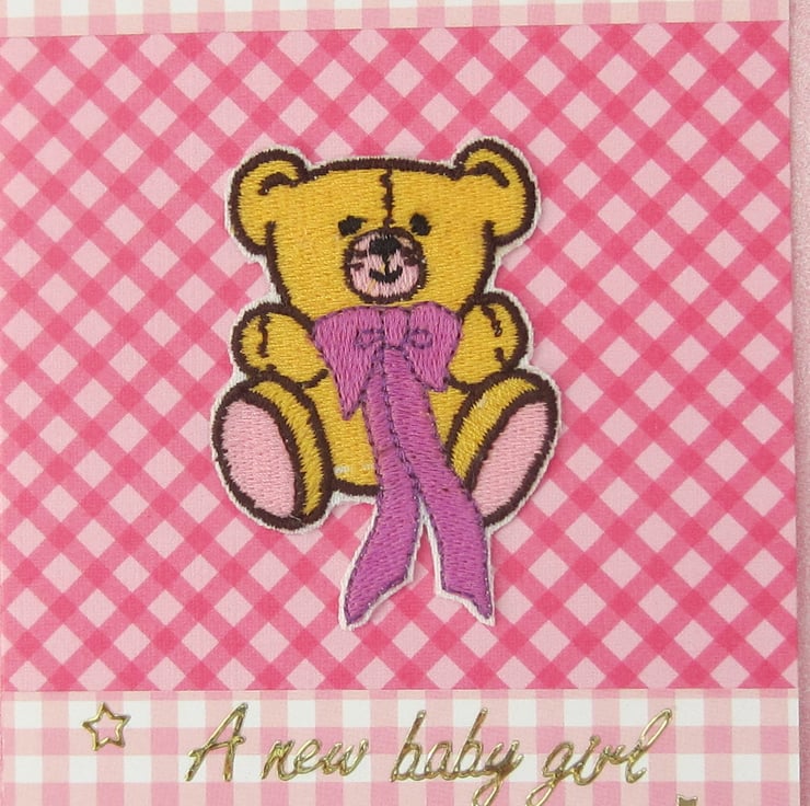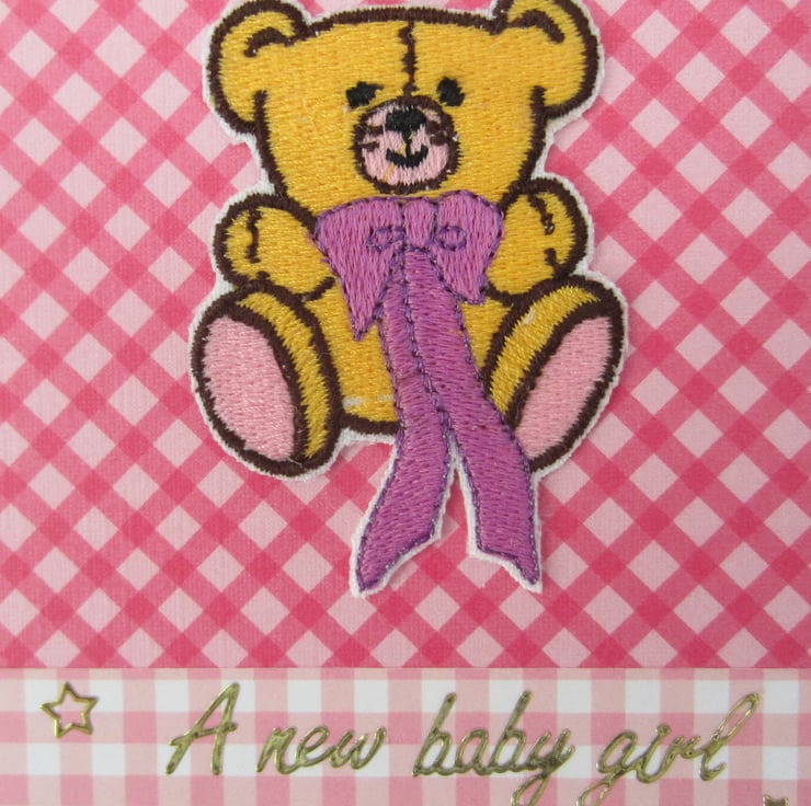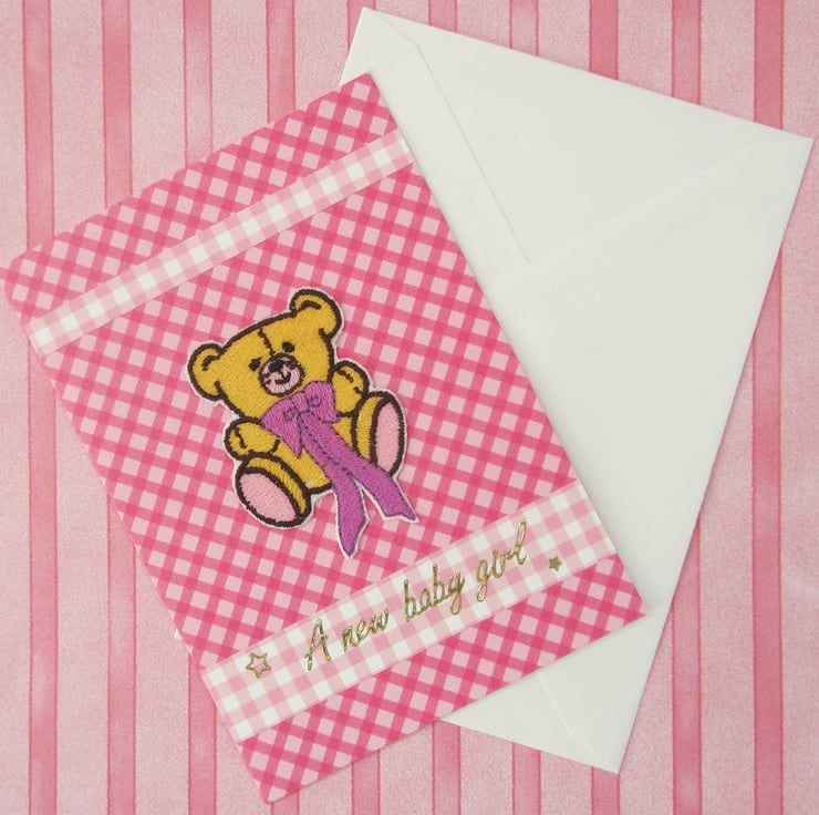 New Baby Girl card with machine embroidered teddy bear on a pink patterned background. It is blank inside and measures 14.5 x 10.5 cm.
