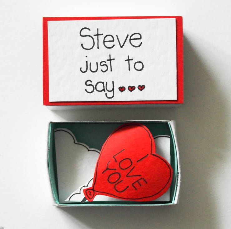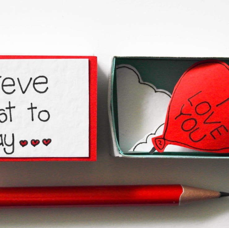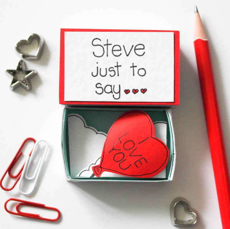 A unique personalised matchbox Valentine's, Love card. Be different and give your loved one something other than a card. This is very much a keepsake. A sweet message on the outside and a surprise inside, a cute heart shaped balloon saying how much you love them.