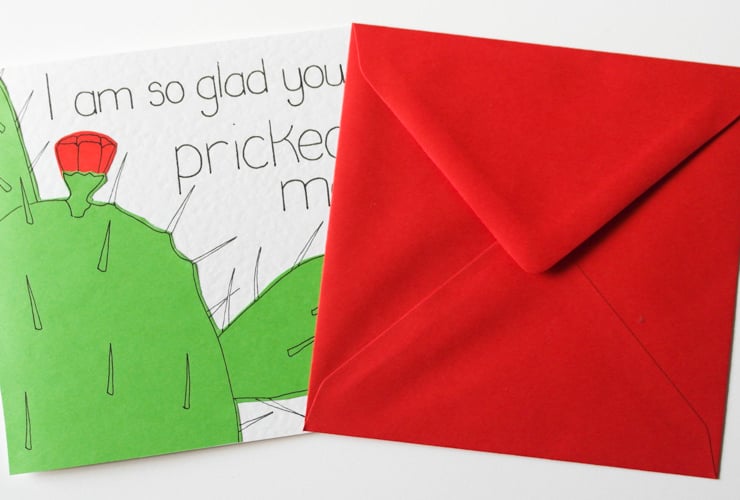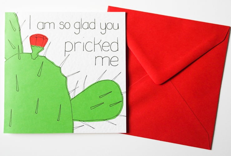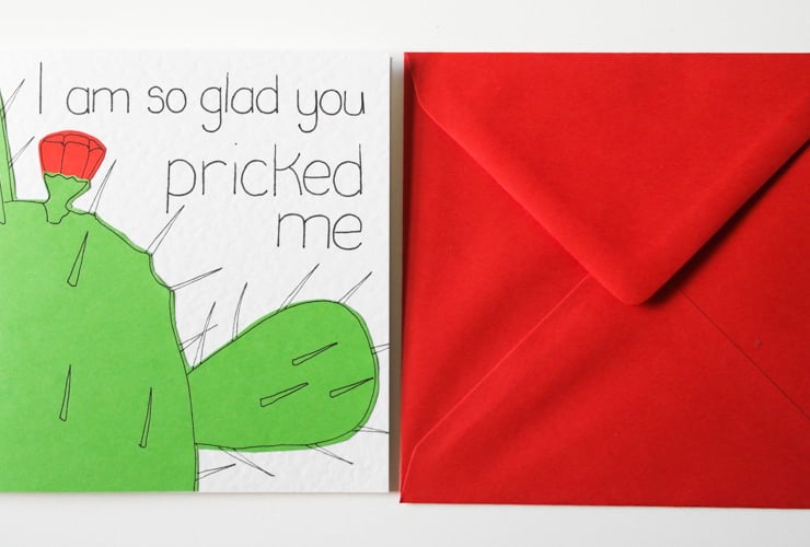 A naughty cactus love card. Ideal as a Valentine's day, Anniversary or Birthday card. Not a mushy card but one that will make your partner's day. A funny pun telling them that you are glad that they pricked you!