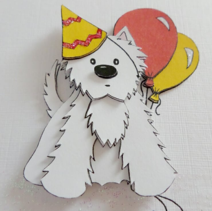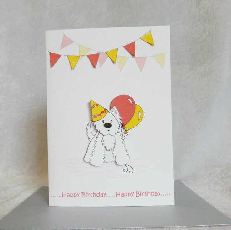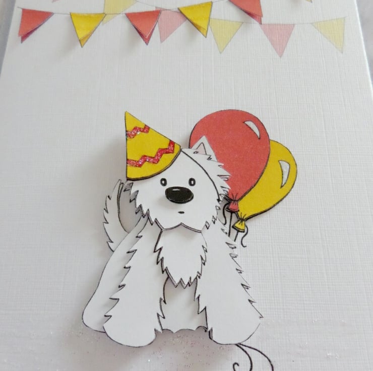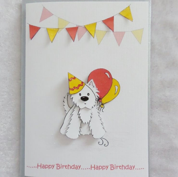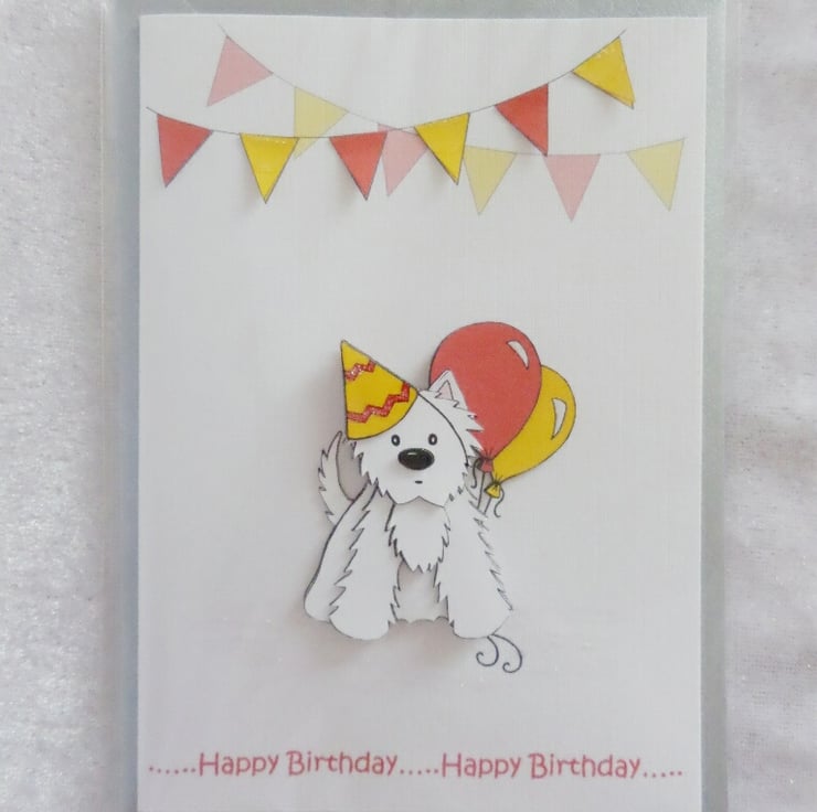 This cute Westie birthday card has been created using my own decoupage, designed from my own original artwork. The A6 card has been made using good quality linen embossed white card and comes with a silver coloured envelope. I have also added a little bit of glitter sparkle to finish the card off.