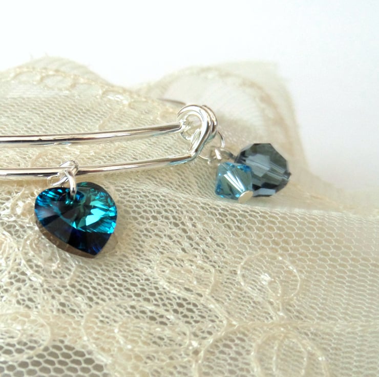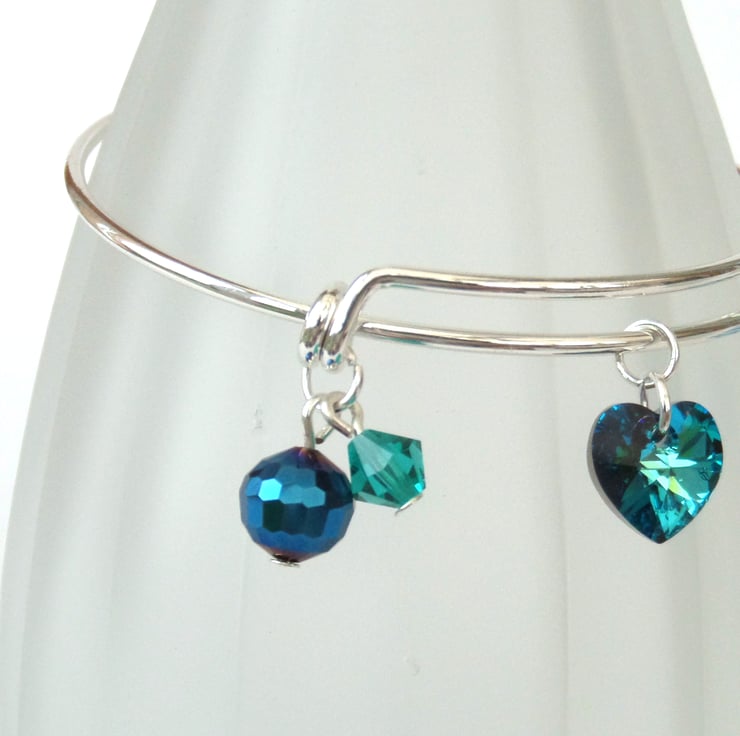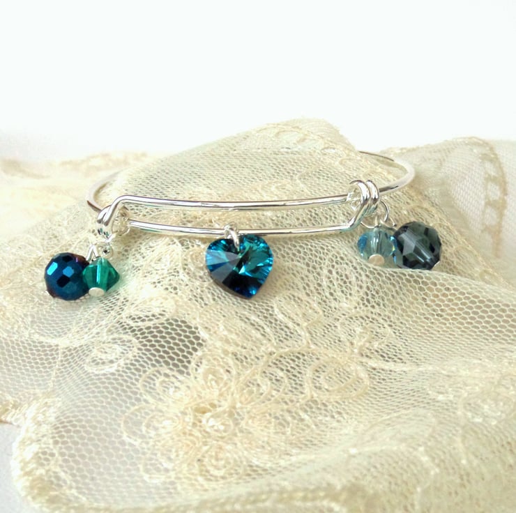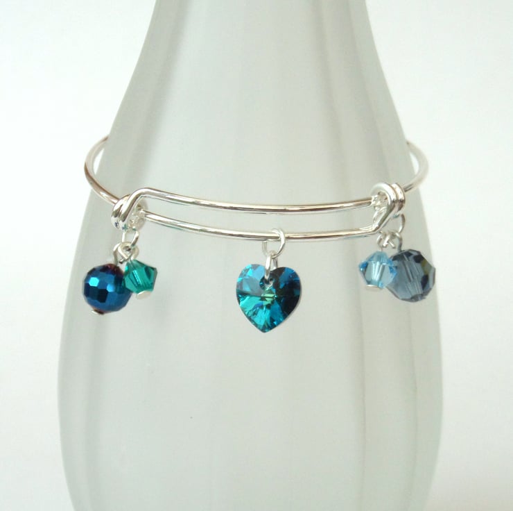 A lovely handmade bangle style bracelet, with blue green crystals, completed with a stunning bermuda blue crystal heart by Swarovski®