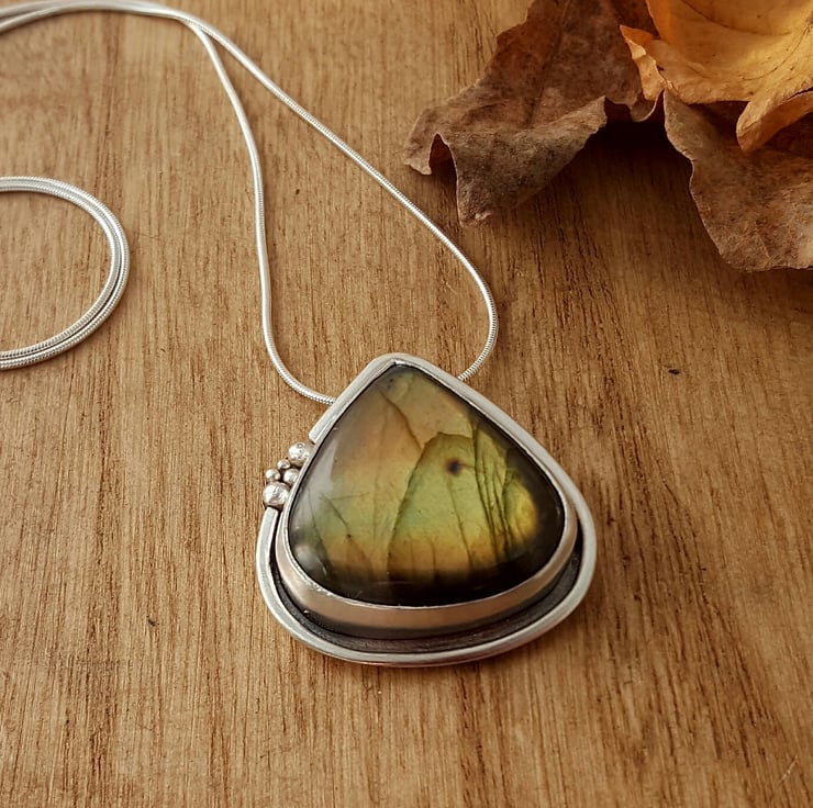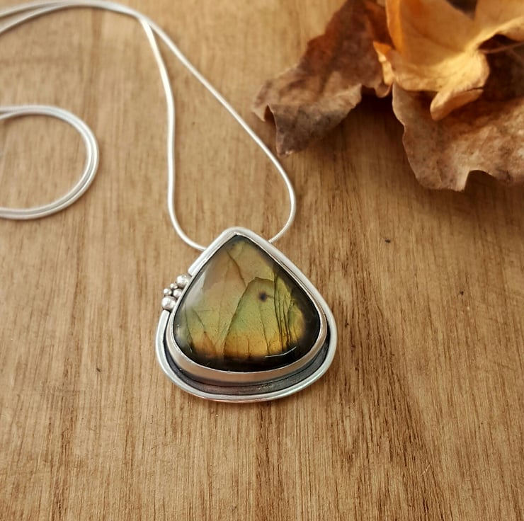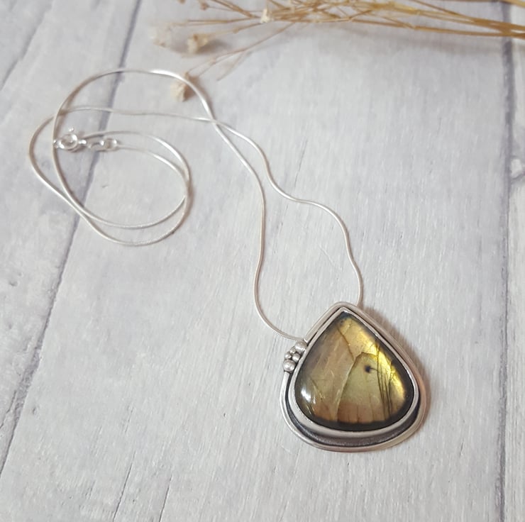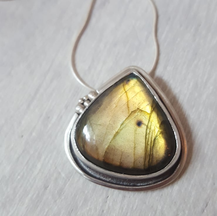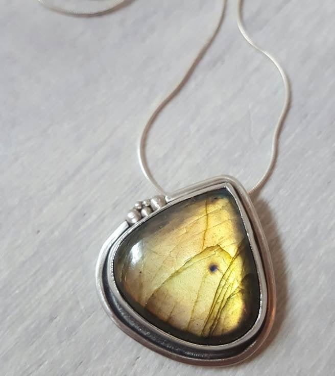 A beautiful labradorite and silver pendant entirely made by hand in my Lancashire studio.