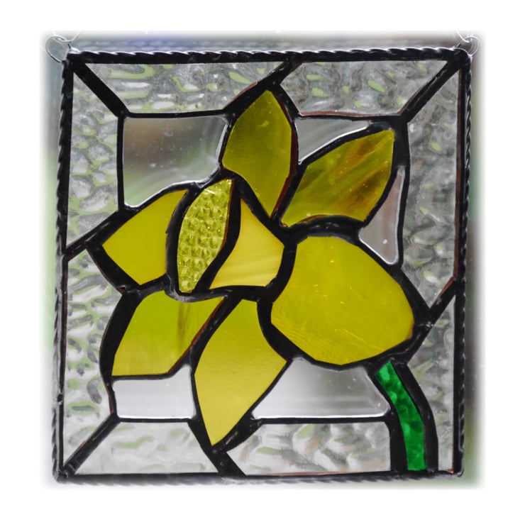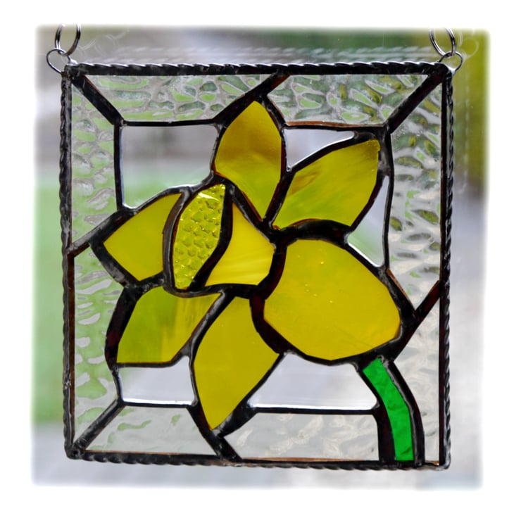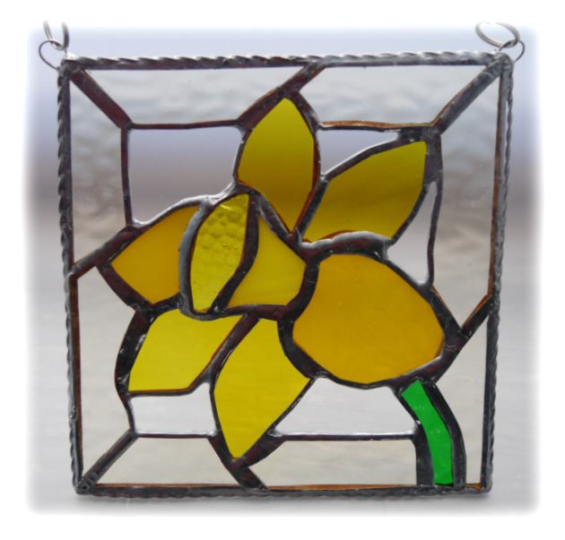 The petals and trumpet in the middle are from 5 different types and textures of bright yellow glass. The streaks in the glass and different shades and textures gives it all movement especially when it catches the light.