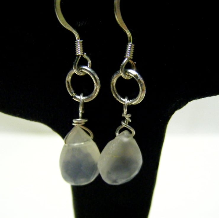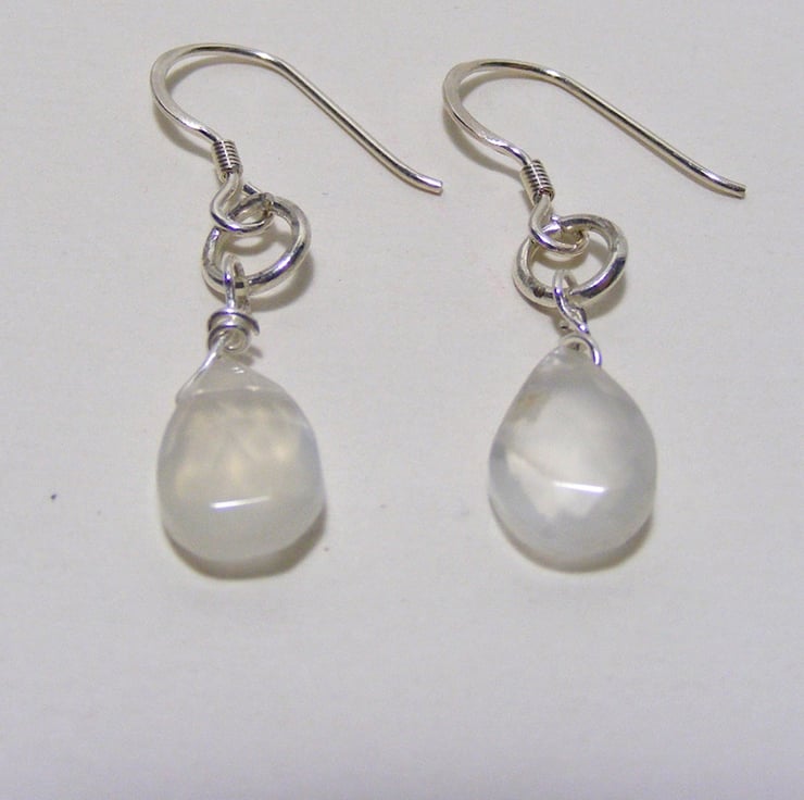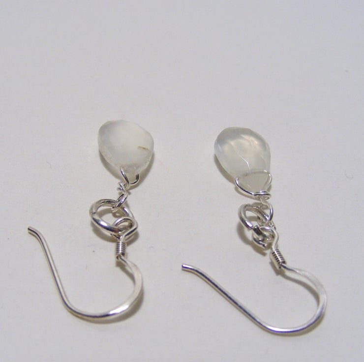 Semi precious gemstone earrings are made with 7 mm white moonstone pears, 925 sterling silver wire, jump rings and ear wires. Ear wires are 925 stamped.