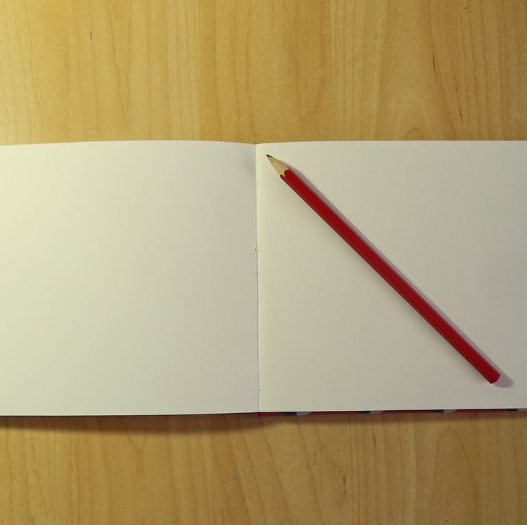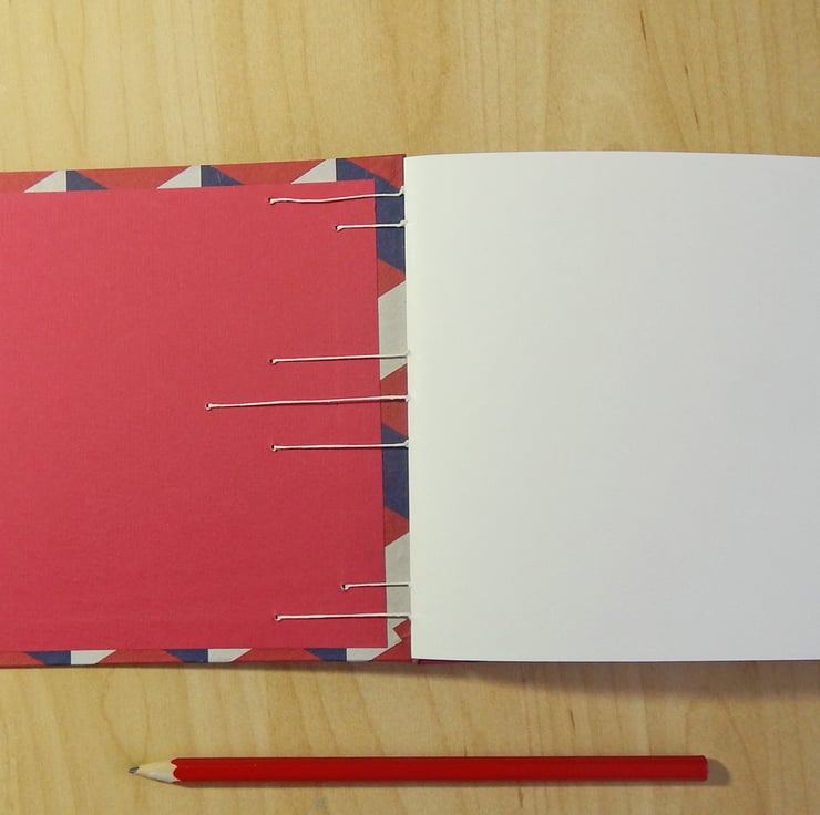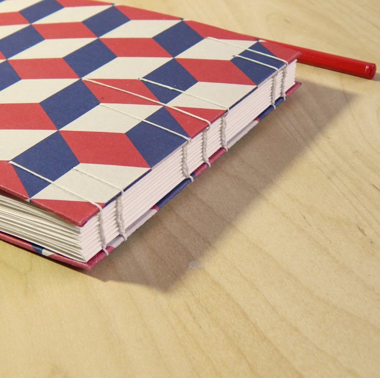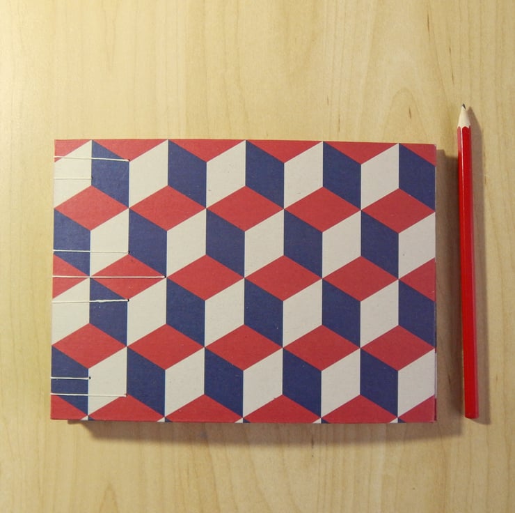 A hand bound sketchbook, A5 landcape, with a block pattern cover in Red and Navy blue, on a pale grey background. The covers are lined in bright red art paper.