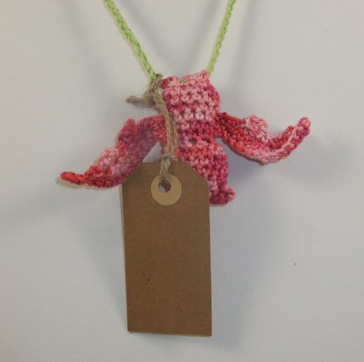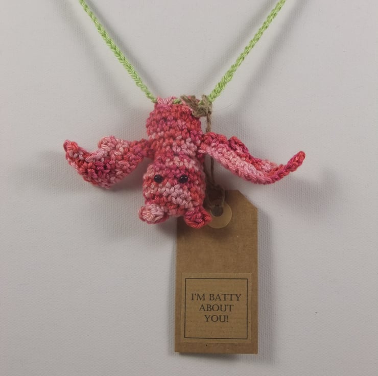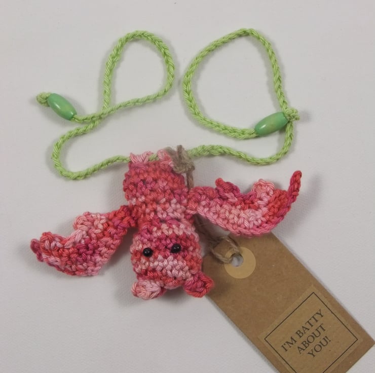 This love-struck bat is the perfect way to tell a special someone how you feel about them and would make an ideal anniversary, Valentine’s or ‘just because’ keepsake gift. It is crocheted in cotton from a pattern by Lucy Ravenscar (www.lucyravenscar.etsy.com). and stuffed with polyester fibre. It has beady black eyes and is hanging by its toes from a pale green string which has a wooden bead at each end for easy tying. There is a tag attached which reads ‘I’m batty about you!’ although I would be very happy to exchange this for one bearing a message of your choice.