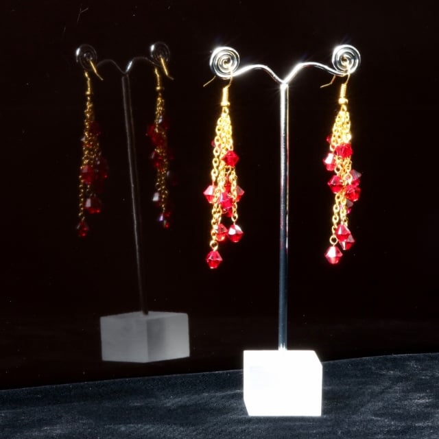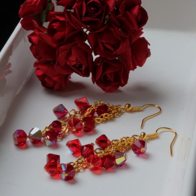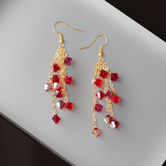 These cascade earrings in lovely rich shades of red on gold chain, are a little longer then I usually make them. The crystals are 6mm Swarovski bicones in light siam and siam. Some of the crystals have an AB coating which makes them shimmer and sparkle when the wearer moves their head. There are ten crystals in each earring.