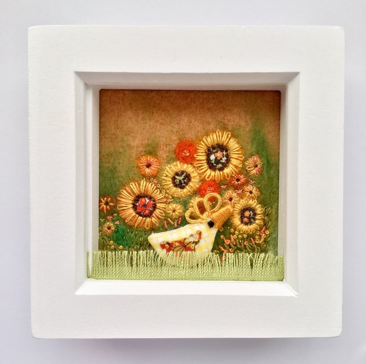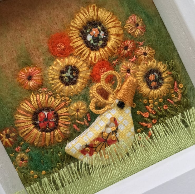 A tiny original piece of textile loveliness, I have hand embroidered into a needle felted background to create a patch of sunflowers. A variety of stitches have been used including lazy daisy, French knot and bullion to give a feeling of depth. Mavis herself has been made out of a teeny piece of gingham with a Liberty fabric wing.