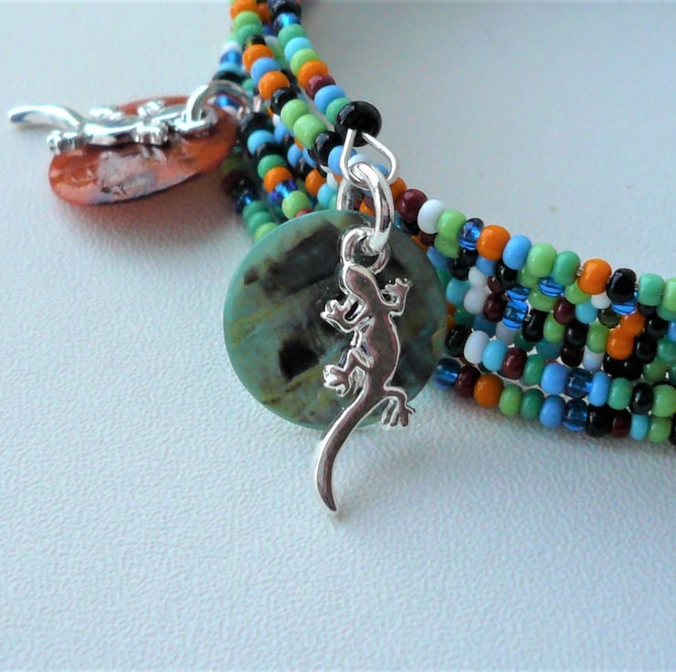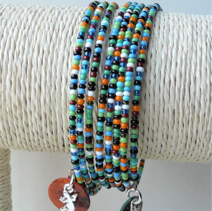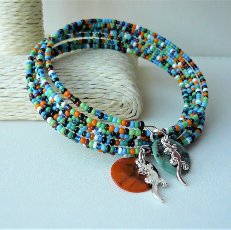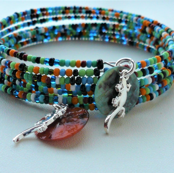 Pretty memory wire wrap bracelet made up of 2/3mm glass seed beads in various bright colours all threaded onto eight coils of silver plated memory wire and finished off with co-ordinating 15mm shell discs and silver plated lizard/gecko charms at each end.