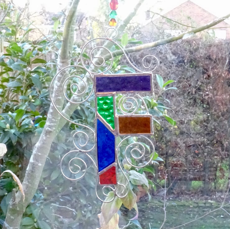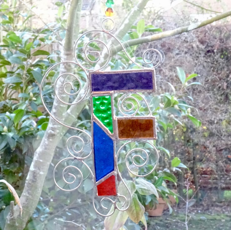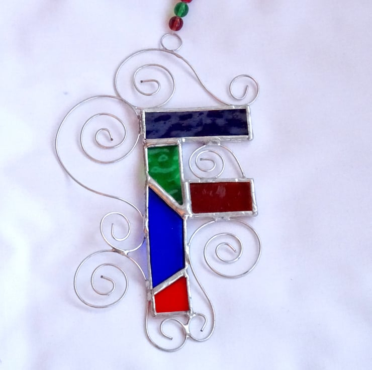 This letter has been made from different pieces vibrantly coloured stained glass. Each piece of glass has been hand cut, ground, foiled, and soldered together, washed and polished. Twisted tinned wire is added for extra interest. A ring, length of beaded fishing line and a hook has been attached for hanging purposes.