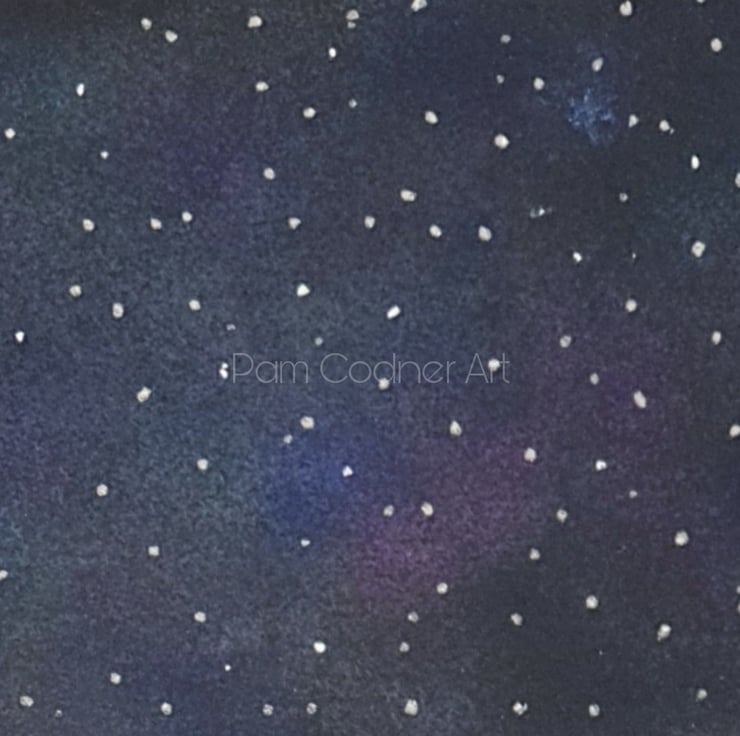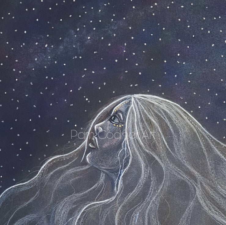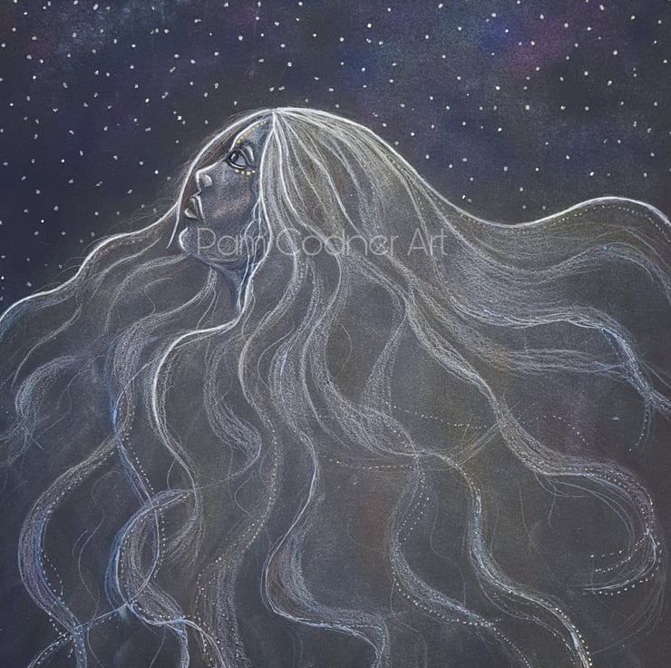 This unique drawing has been created on Strathmore Artagain coal black paper. I have used Faber Castell Polychromos pencils, Inscribe pastels and glitter pens. This drawing has been fixed with Windsor and Newton fixative spray.
