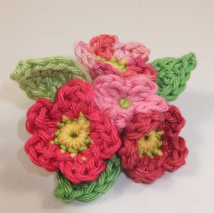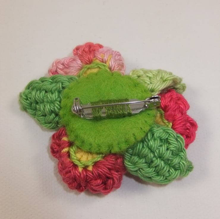 The flowers on the brooch are crocheted in 100% cotton and then stitched to a craft felt backing for added strength, and this is in turn sewn to the brooch pin. The brooch is approximately 6 cm in diameter.