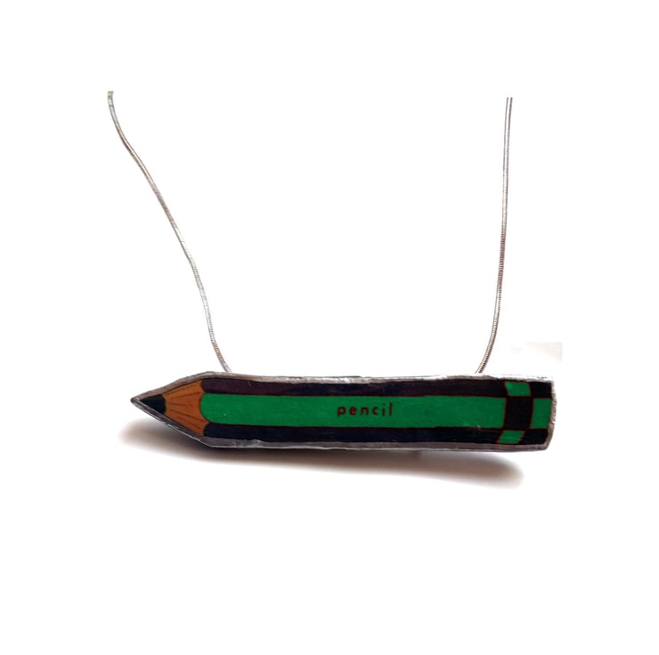 This pencil necklace measures approx 7.5cm x 1.3cm at the furthest points and is 5mm thick. It hangs on an 18" chain which is nickel and lead free.