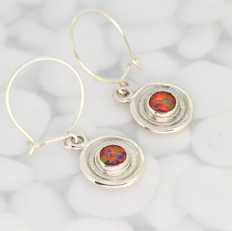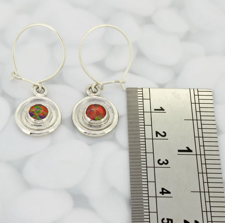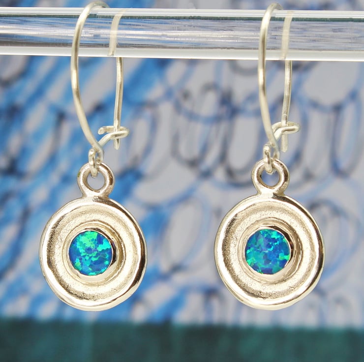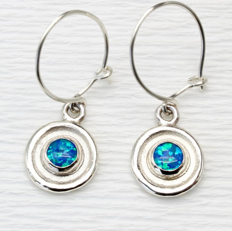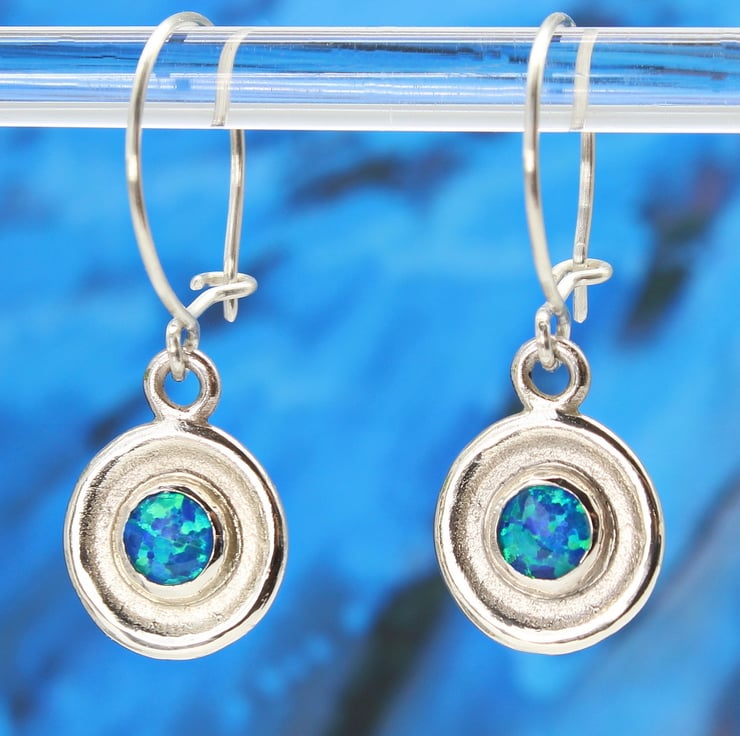 These handmade, sterling silver earrings, feature two of our wonderful 6mm lab. grown blue opal triplet gemstones. The earrings measure 14mm in diameter and they hang off sterling silver ear wires, which we also make by hand and they have a total drop length of 24mm. We love these earrings because the simple, elegant design shows off the gemstones beautifully. These earrings have been bought as wedding jewellery because we also make a matching pair of cufflinks.