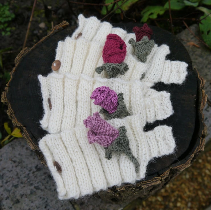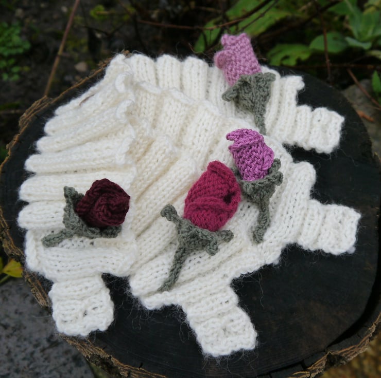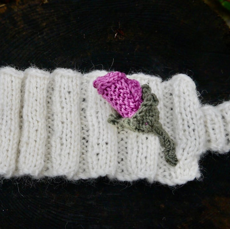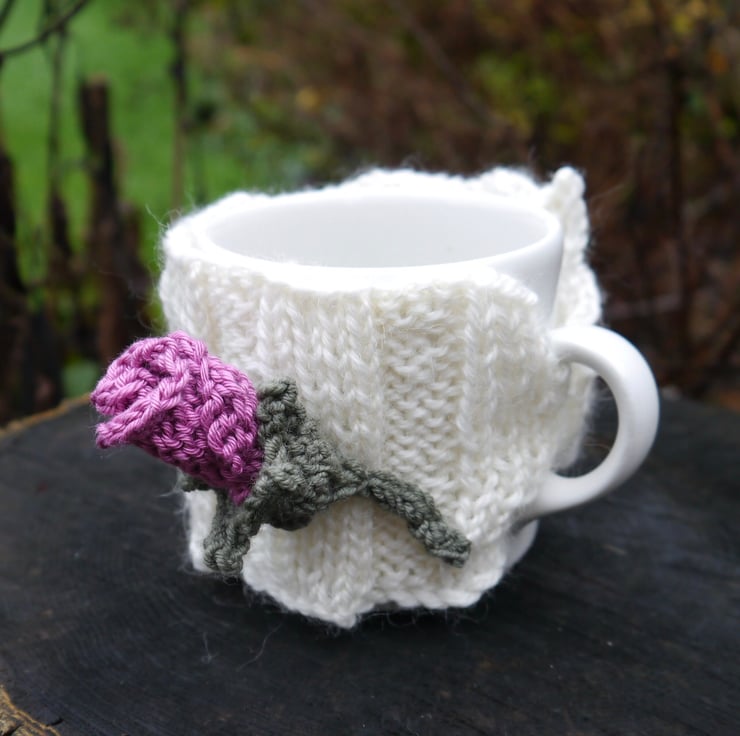 A beautiful hand knitted pink rose adorns this romantic cream mug cosy. A perfect gift for the love of your life or anyone who loves roses.